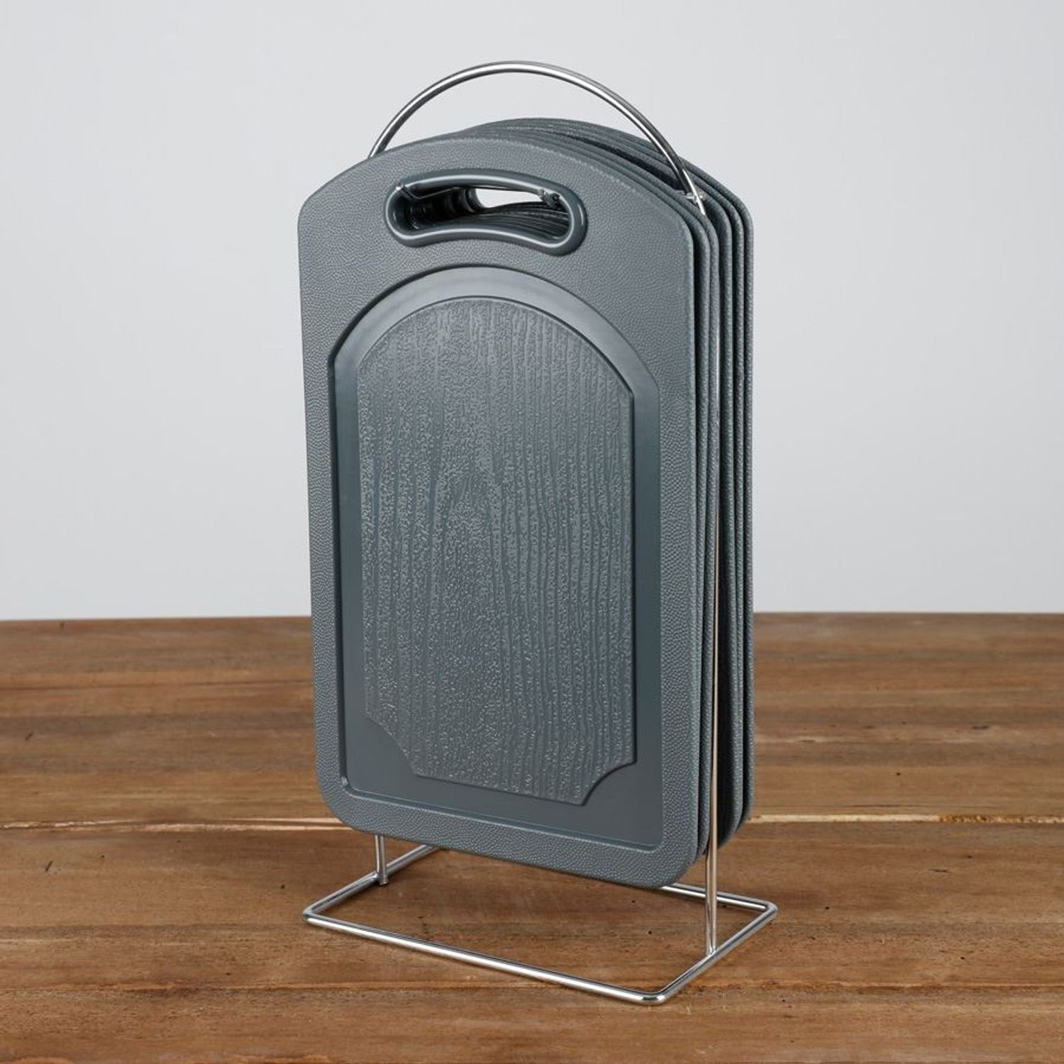 Praktischer und platzsparender Metall-Brettchenständer mit 6 Kunststoffbrettchen in Dunkelgrau im Set. Ideal als Frühstücksbrettchen oder zum Schneiden verschiedener Lebensmittel.
