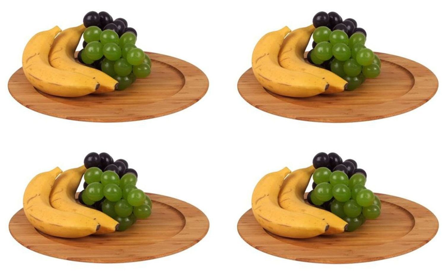 Robuster Dekoteller aus Bambusholz zum Dekorieren und Servieren von Obst und Gemüse. Aufgrund der starken Oberflächenhärte und Schneidebeständigkeit ist der Teller auch als Schneidebrett nutzbar.