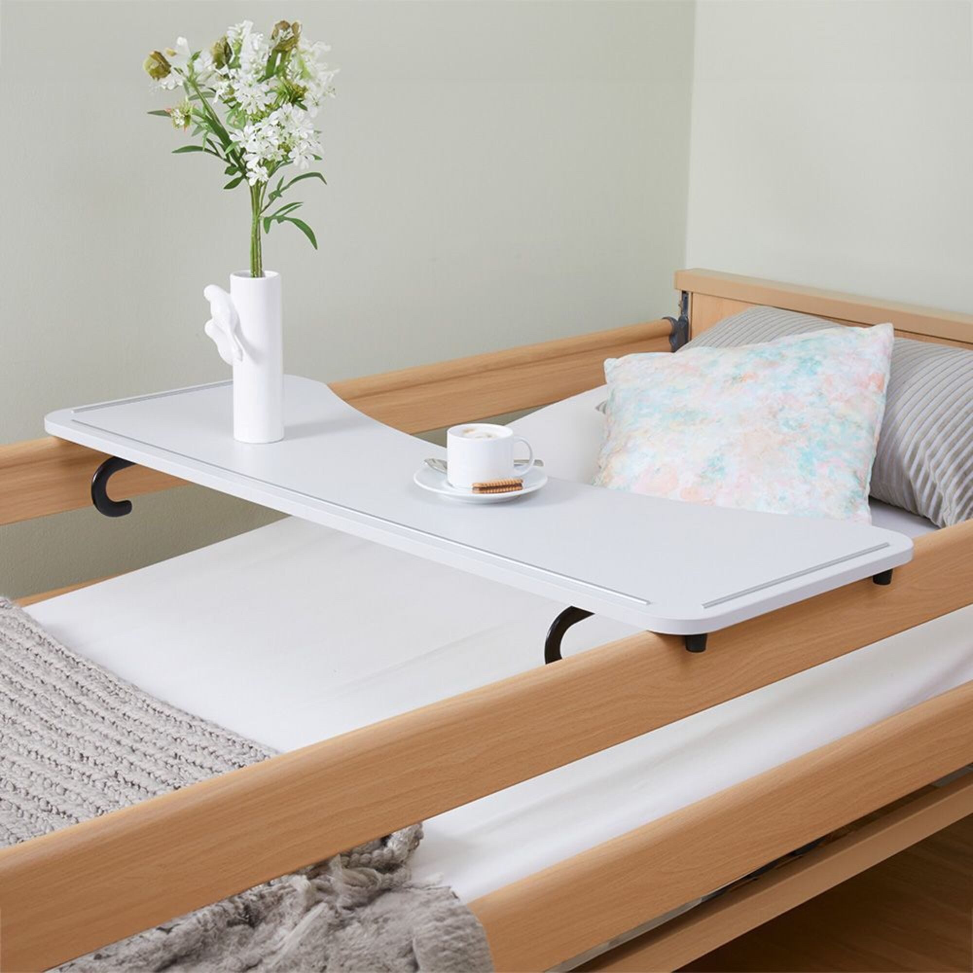 Das BURMEIER Serviertablett: Praktisches Pflegebetten Zubehör Dieses zweckmäßige Serviertablett ist passend für alle BURMEIER Pflegebetten mit einer Liegeflächenbreite von 90 cm und durchgehender Seitensicherung. Das Tablett wird einfach auf die angestellten Seitengitterholme Ihres BURMEIER Bettes gelegt und kann anschließend leicht vor- und zurückgeschoben werden. Das Tischchen erleichtert dem Patienten im Bett nicht nur das Essen, auch kann das Tablett als Ablage für Bücher oder ähnliches genutzt werden, wenn der Nutzer mithilfe der Rückenteilverstellung aufrecht im Bett sitzt. Das Serviertablett ist einseitig mit einer rundlichen Aussparung versehen, damit es nah an den Nutzer herangeschoben werden kann. Nach Gebrauch kann es einfach am Seitengitter befestigt werden, damit es im Alltag nicht stört. Farblich ist dieses Pflegebett Zubehörteil in Weiß gestaltet und passt somit perfekt zu jeder Einrichtung. Es ist für alle Modelle mit 90 cm breiter Liegefläche und durchgehender Seitensicherung (DSG) geeignet. Das Tischchen erleichtert dem Patienten im Bett nicht nur das Essen, auch kann das Tablett als Ablage für Bücher oder ähnliches genutzt werden, wenn der Nutzer mithilfe der Rückenteilverstellung aufrecht im Bett sitzt. Das Serviertablett ist einseitig mit einer rundlichen Aussparung versehen, damit es nah an den Nutzer herangeschoben werden kann. Nach Gebrauch kann es einfach am Seitengitter befestigt werden, damit es im Alltag nicht stört. Farblich ist dieses Pflegebett Zubehörteil in Weiß gestaltet und passt somit perfekt zu jeder Einrichtung.