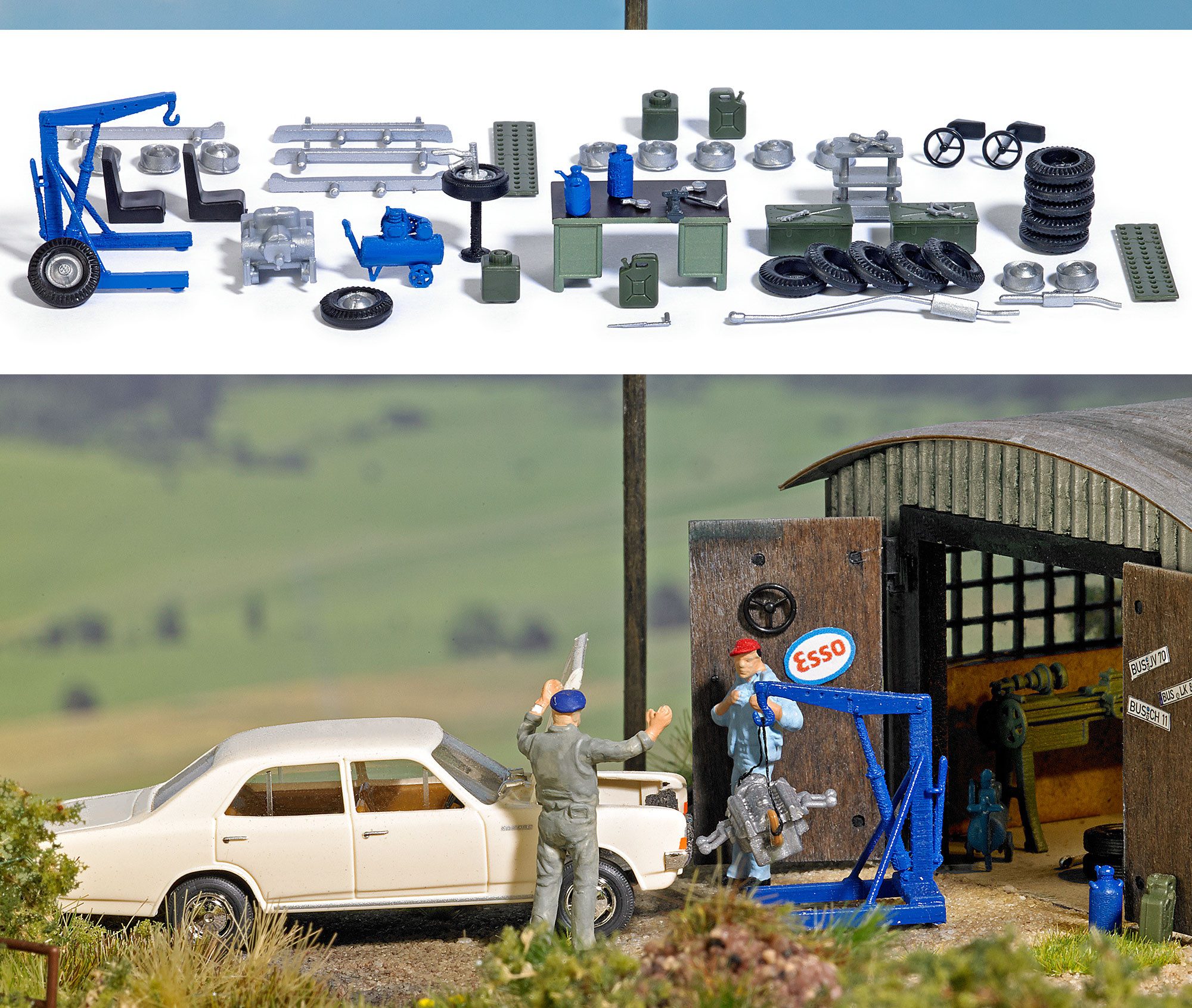 Für die Einrichtung einer KFZ-Werkstatt: Montagekran, Motorblock, Reifenmontage, Kompressor, Werkbank mit Schraubstock, Werkzeugwagen, Werkzeug, Ölkannen, Werkzeugkisten, Auffahrbleche, Kanister, Wagenheber, jeweils 12 Reifen und Felgen, Autositze, Lenksäulen und Stoßstangen. Bausatz. Geeignete Gebäude z.B. Gewerbehalle 1548 oder Schuppen 1593 bzw. 1595.