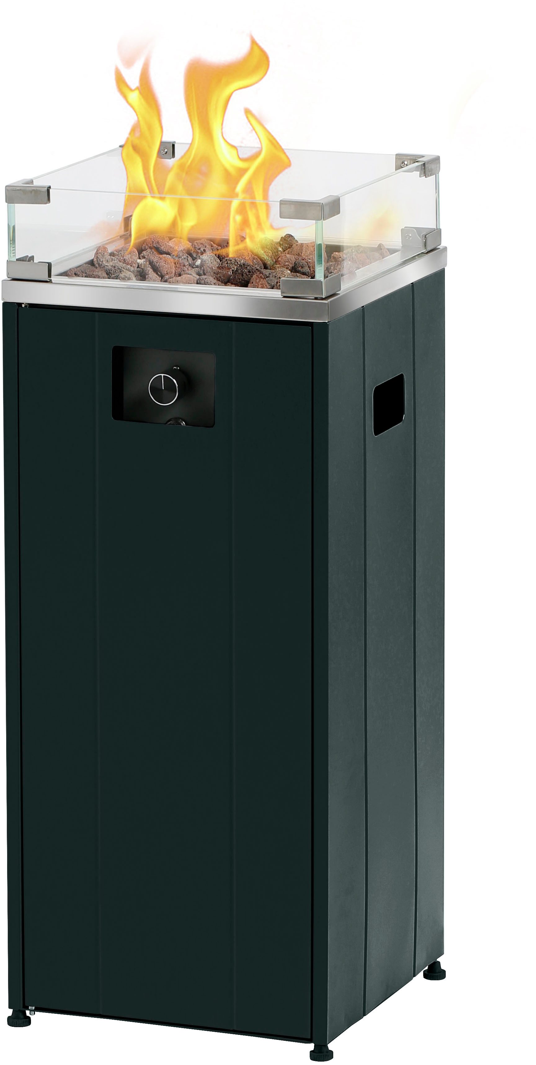 Lieferumfang | 1 Feuersäule, 1 Sack Lavasteine, 4 Füße, 4 Glasscheiben, 8 Glasscheibenhalter, Anschlussschlauch, Aufbauanleitung, Druckminderer, Montagematerial |