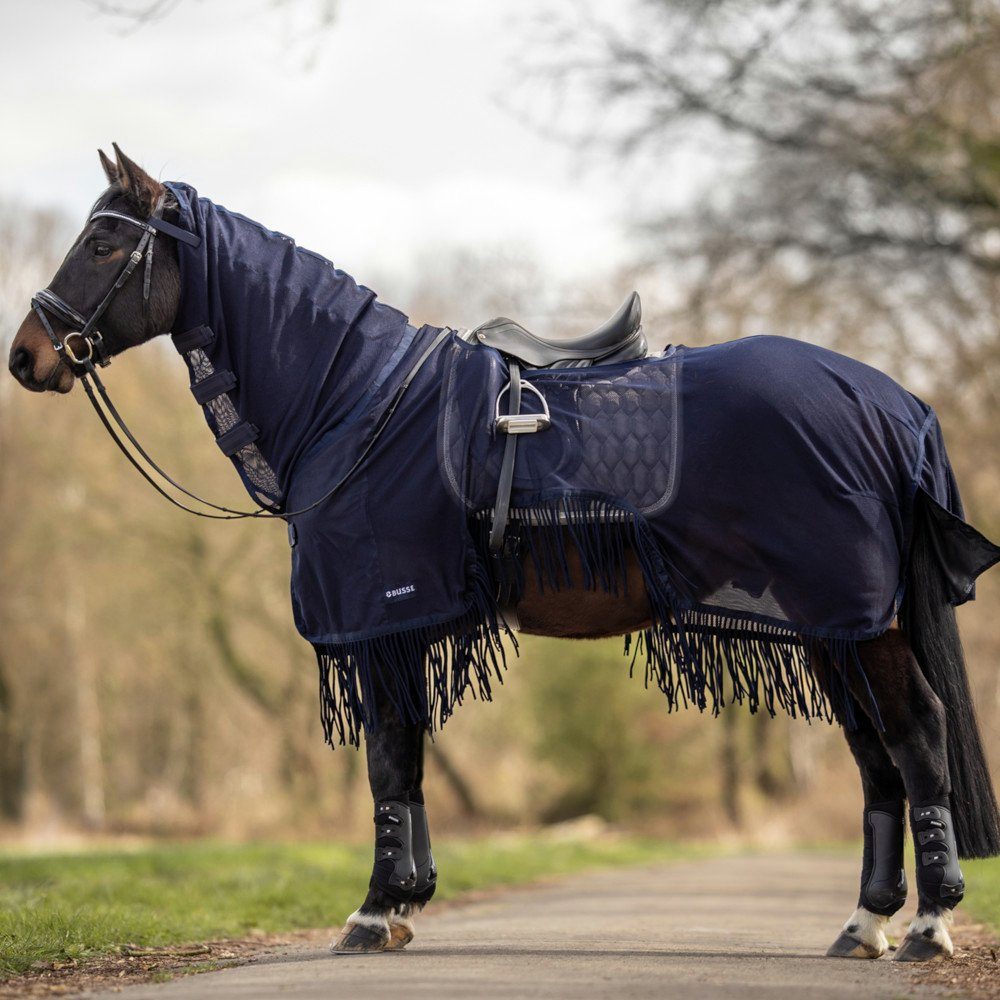 Die Busse Fliegendecke / Ausreitdecke MOSKITO-FRANSEN III ist so geschnitten, dass möglichst viele Körperbereiche des Pferdes vor Insekten geschützt sind, aber dennoch genügend Bewegungsfreiheit für Pferd und Reiter besteht. So hat die Decke im Bauchbereich eine Aussparung, damit Schenkelkontakt und die Hilfengebung noch klar beim Pferd ankommen.