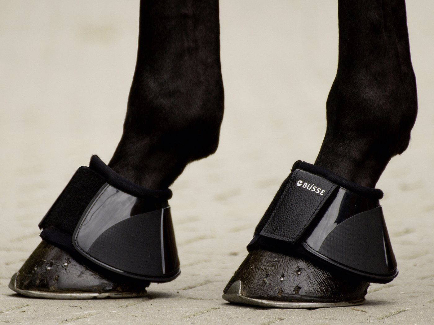 Die Busse Hufglocken Pro sind mit einem zusätzlichen Schlagschutz ausgestattet. Dieser wird in Form einer PVC-Schale ermöglicht und macht die Hufglocke noch strapazierfähiger und sicherer. Dank der anatomischen Form und dem wirkungsvolle Drehstopp wird die Hufglocke optimal in Position gehalten. Eine hautfreundliche Nylonjersey-Oberfläche und ein rund gearbeiteter Abschluss schaffen einen hohen Tragekomfort und vermeiden die Bildung von Druckstellen. Mit dem starken doppelten Klettverschluss ist die aus synthetischem Kautschuk hergestellte Hufglocke einfach am Pferd zu befestigen.