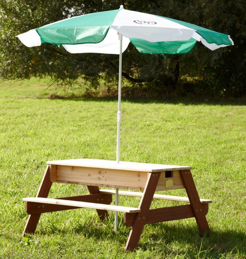 An diesem Picknick-Tisch können Kinder sitzen, spielen, essen und Spaß haben. Aber es gibt noch mehr: Der Tisch hat Geheimfächer, die mit Sand und/oder Wasser befüllt werden können. Diese klassische Kombination sorgt dafür, dass Kinder sich amüsieren können und ihre Kreativität angeregt wird. Der kostenlose Schirm stellt sicher, dass die Kinder sicher und im Schatten geschützt spielen können.