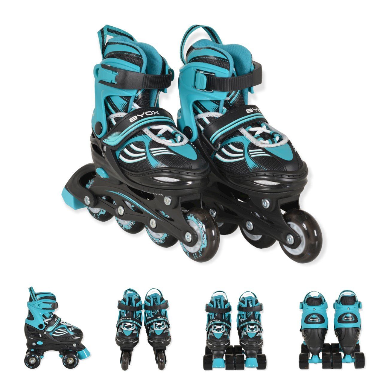 Die Inliner 2 in 1 Double blau von Byox lassen sich ganz einfach zu Rollschuhen umbauen. Die Inliner sind für Kinder ab 3 Jahren und einem Maximalgewicht von 60 kg geeignet. Dank der vierfach Größenverstellung, die durch einen Seitenknopf gedrückt wird, kann die gewünschte Размер eingestellt werden. Durch die doppelt gesicherte Schnalle sowie dem Klett hat Ihr Kind einen sicheren Halt. Durch das Bewegen der Rollen beginnen die PU-LED-Räder zu leuchten.
