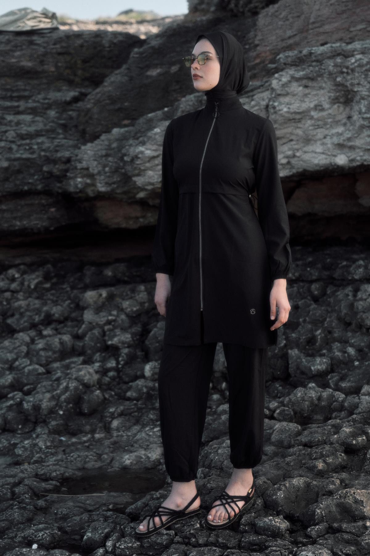 Diese funktionale und stilvolle Hijab-Badeanzug-Modell legt Wert auf Komfort in jedem Detail. Der dünn gepolsterte und separat angebotene Bustier bietet Unterstützung und ermöglicht gleichzeitig eine vielseitige Outfit-Wahl. Das Kopftuch bedeckt vollständig den Hals, um Probleme wie das Öffnen im Wasser zu vermeiden und einen sicheren Gebrauch zu gewährleisten. Der durchgehende Reißverschluss auf der Tunika ermöglicht ein einfaches An- und Ausziehen und die elastische Taillenregulierung sorgt für individuellen Komfort. Die Schlitze am Saum sorgen für Bewegungsfreiheit und verleihen dem Design einen modern