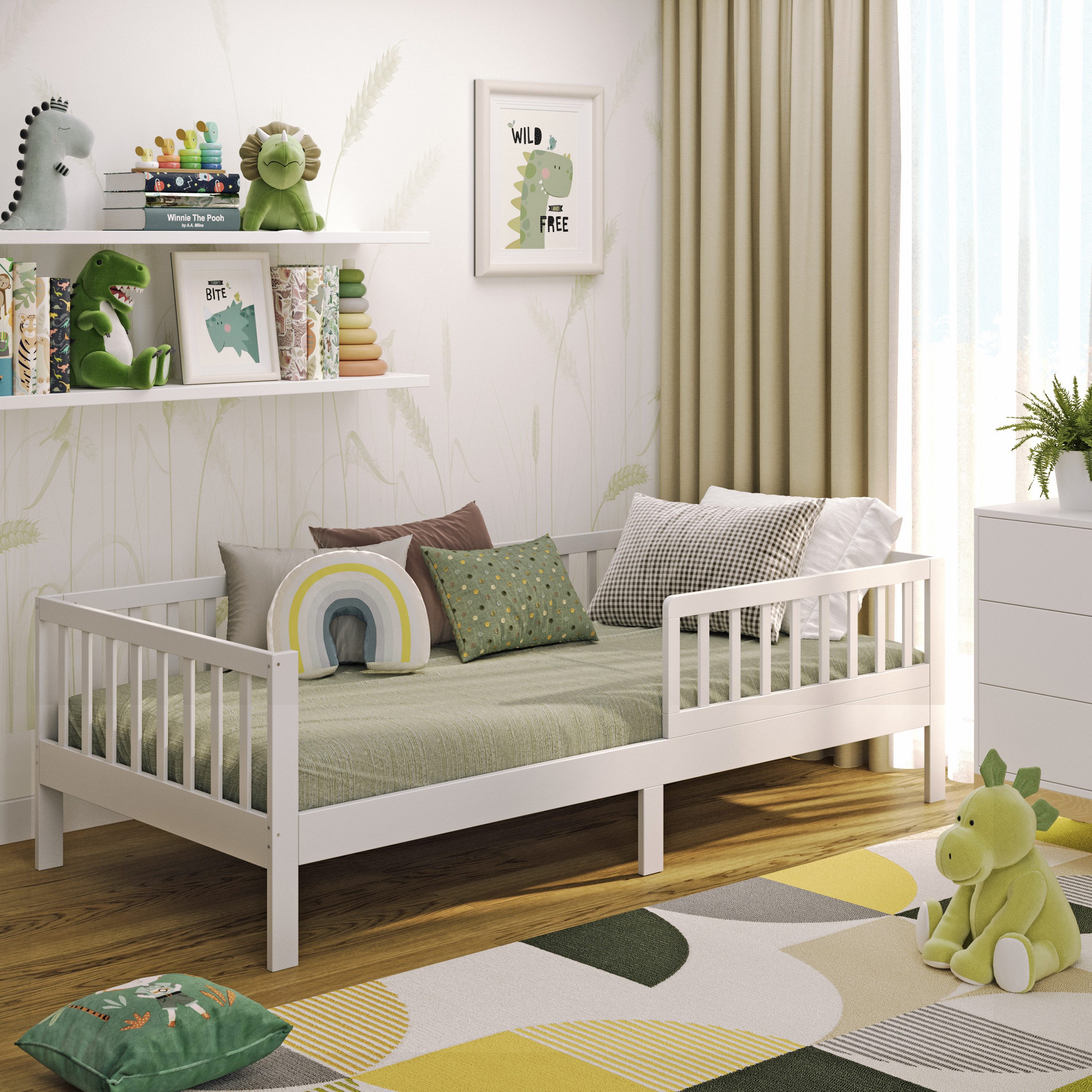 Zwei integrierte Schubladen unter dem Bett bieten wertvollen Stauraum für Spielzeug, Kleidung oder Bettwäsche. So bleibt das Kinderzimmer aufgeräumt – auch wenn’s mal schnell gehen muss. Der abnehmbare Rausfallschutz sorgt dabei für zusätzliche Sicherheit.