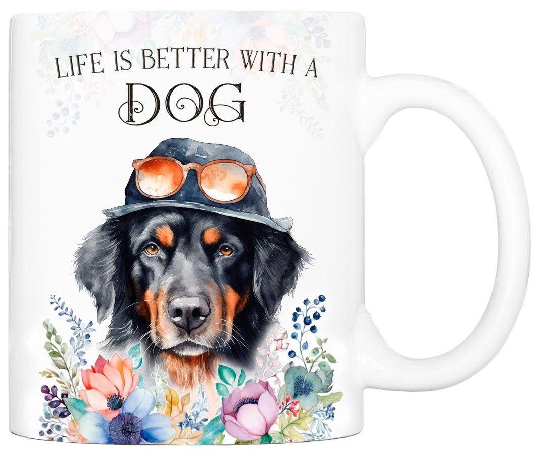 Die fröhlich bunte Tasse mit Hunderasse im Watercolor-Stil und "Life is better with a Dog" Schriftzug macht den Kaffee am Morgen und den Tee am Abend zu etwas ganz Besonderem!
