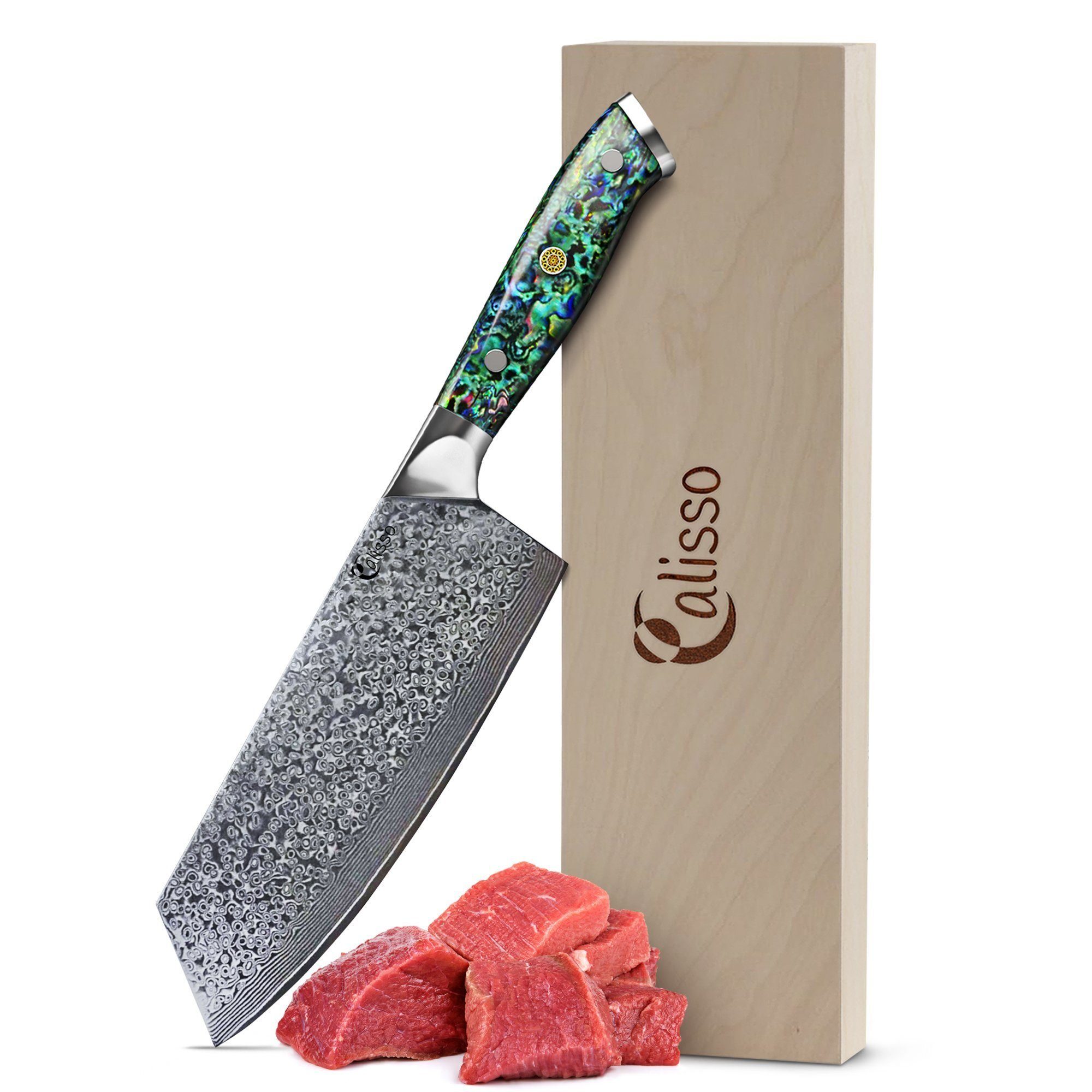 Mit dem Chai Dao verbringen Sie wahre Wunder in Ihrer Küche! Der chinesische Всеskönner eignet sich dank seiner leicht gebogenen Klingenform und seiner außerordentlichen Klingenschärfe für die Zubereitung von Gerichten aller Art. Der ergonomische Griff liegt dabei stets sicher in Ihrer Hand, sodass selbst längere Küchensessions zum angenehmen Kocherlebnis werden. Dieses Chai Dao Kochmesser ist ein echter Hingucker ob beim Kochen, bei Familientreffen oder als Geschenk für einen besonderen Menschen, Calisso Messer kann man nicht übersehen. Diese feine Klinge bleibt durch die hohe Qualität des Damaststahls auch sehr lange sehr scharf. Das chinesische Hackbeil ist nicht nur durch das Damastmuster einzigartig, sondern wird durch den unvergleichlichen Griff aus Abalone-Muscheloptik zum echten Unikat. Das Damast-Hackmesser sieht nicht nur gut aus, sondern liegt auch extrem gut in der Hand und bleibt auch bei längeren Kochabenden rutschfest und angenehm in der Hand. Produktdetails Unsere Damastmesser bestehen aus verschieden harten Lagen Stahl und Eisen, welche zu 67 Schichten zusammengeschmiedet wurden. Dadurch sind unsere Damastmesser äußerst flexibel, stabil und können besonders scharf geschliffen werden und bleiben lange scharf. Material Klinge: 67 Lagen Damaskus Stahl, bestehend aus 66 Lagen 10Cr15CoMoV und 1 VG-10 Damaskus Stahlkern Material Griff: Acryl und eine Schicht Abalone Muschel Härtegrad: 60 ± 2 HRC Unglaubliche Schärfe durch Schleifwinkel von 15° Der verwendete Stahl und eine gründliche Politur jeder Klinge führen zu guter Rostbeständigkeit. Der Griff ist in Muscheloptik angefertigt und für ausgezeichnete Kontrolle, Agilität und Komfort beim Schneiden entwickelt. Damit liegt das Messer auch über längere Arbeitsphasen in der Küche gut in der Hand. Achtung: Das Messer ist nicht zum Zerhacken von Knochen geeignet! Pflegehinweise Ein gutes Küchenmesser aus Damaskus-Stahl sollte gut gepflegt werden. Lesen Sie sich dafür gerne unsere Hinweise online unter https://calisso.de/pages/pflegehinweise durch.