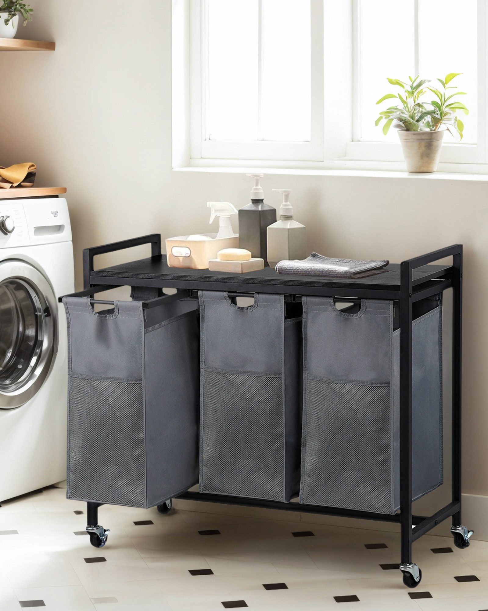 Besonderheiten: Klettverschluss, ausziehbare Wäschesäcke, Ablage mit Lamellen, verstellbare Füße, inkl. Räder