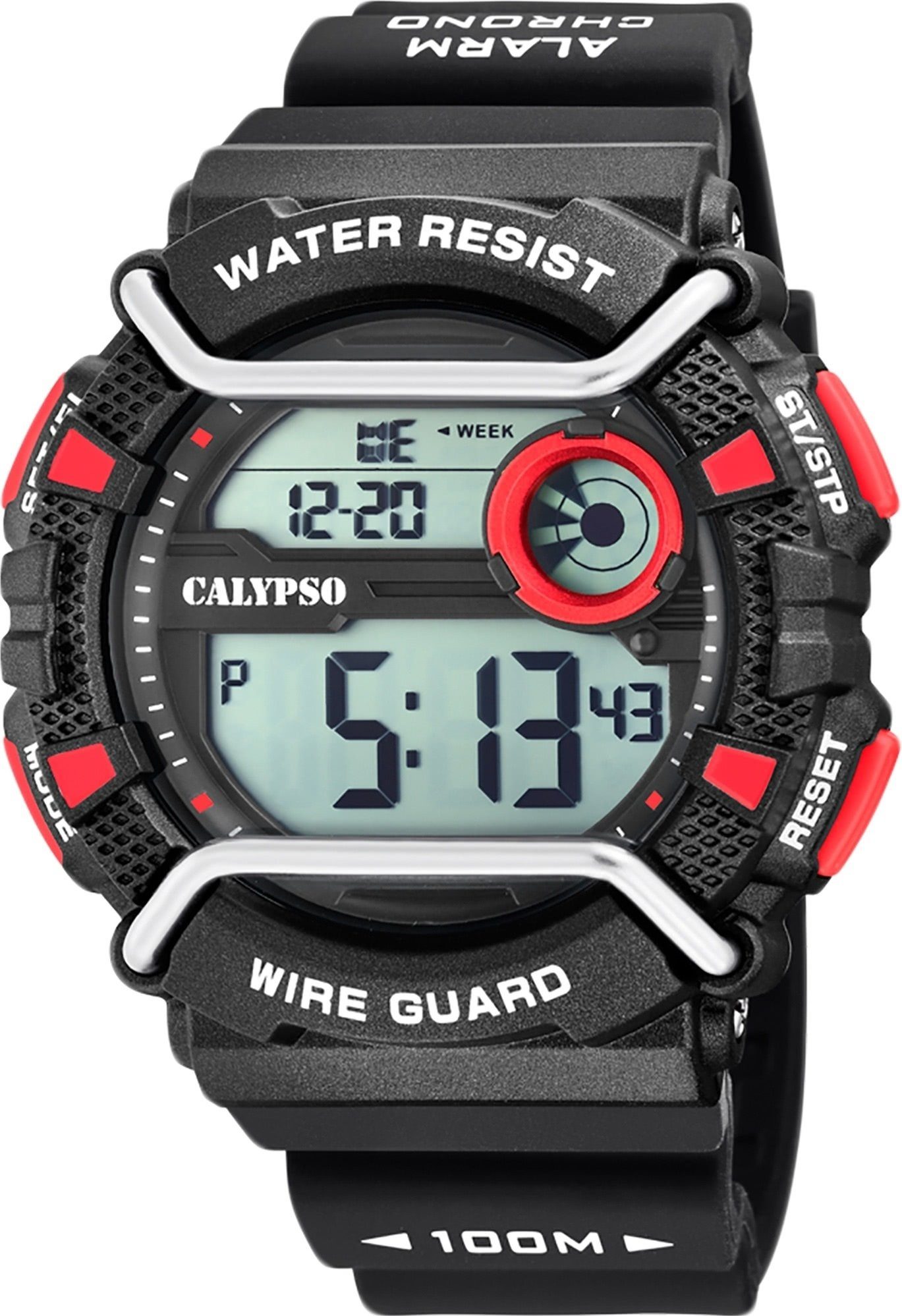 Die Sport Uhr der Marke Calypso hat ein schönes Armband aus Kunststoff PU in schwarz mit Dornschließe. Eine Uhr aus der Calypso Digital Kollektion für Herren in der Gehäusefarbe schwarz rot mit Quarzwerk. Die Digitaluhr mit Kunststoffglas hat ein Zifferblatt in der Farbe grau. Die Form der Uhr ist rund und das Gehäuse ist extra groß ca. 48mm.