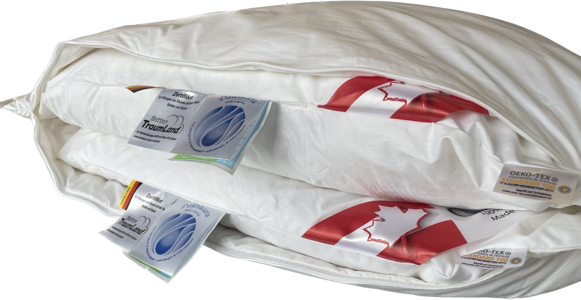 Mit dem Daunenkissen Meisterstück mit individueller Füllmenge ist es möglich, das Daunenkissen auf die gewünschte Höhe anzupassen, um den bestmöglichen Komfort und die optimale Unterstützung zu bieten. Das Besondere und Einzigartige an diesem Meisterstück Canada Daunenkissen ist die Möglichkeit durch den Reißverschluss am Außenkissen die Innenkissen einzulegen.
