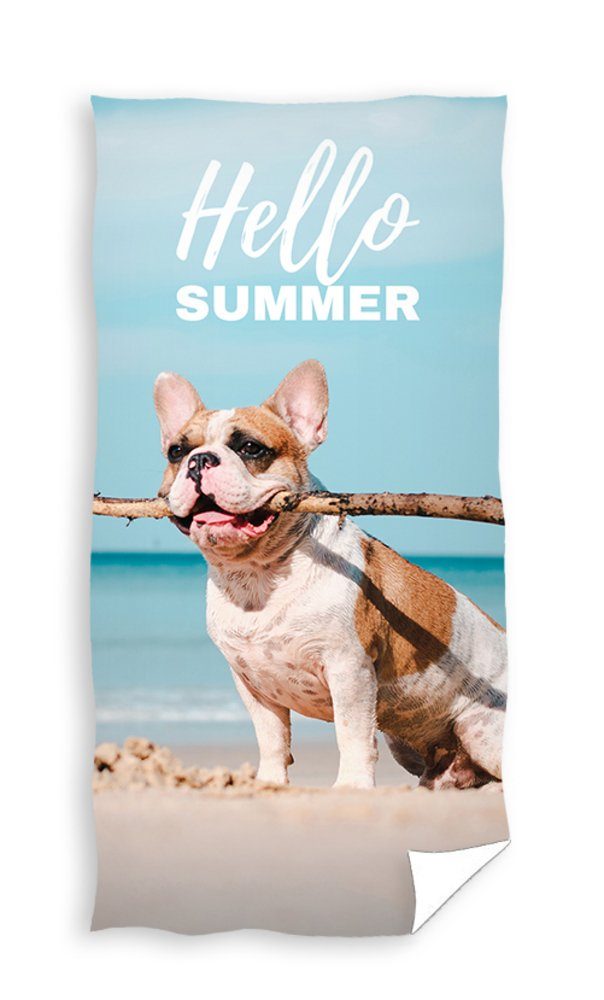Wir empfehlen das bunte und angenehm griffige Badetuch mit den Maßen 70x140 cm: HUND.