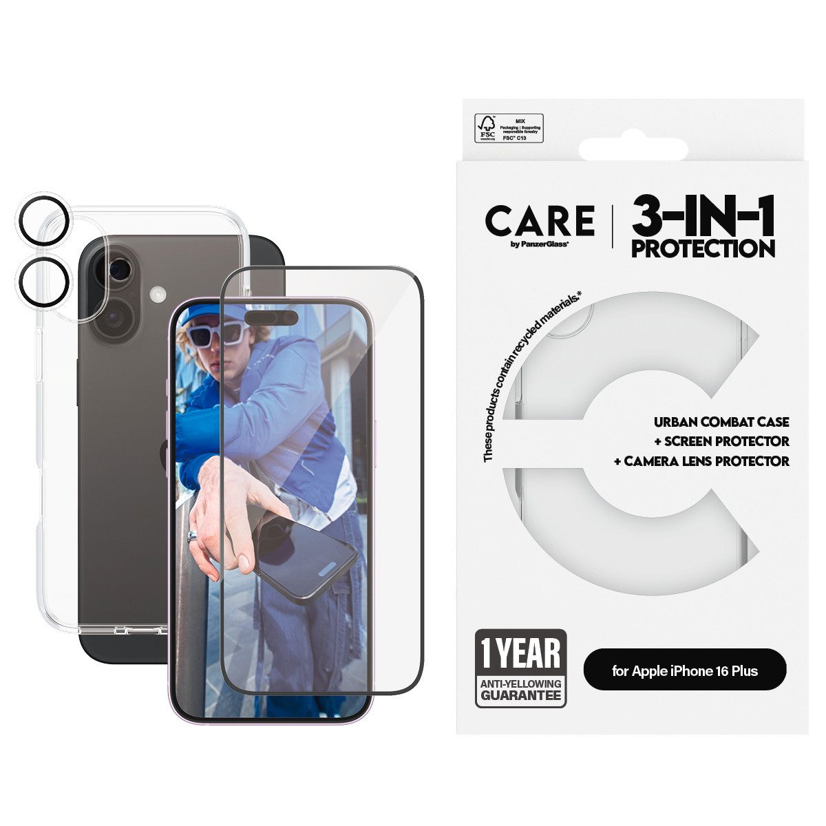 Lieferumfang | Care by PanzerGlass 3-in-1 Bundle, Urban Combat Case, Screen Protector, Camera Lens Protector, Montagehilfe |