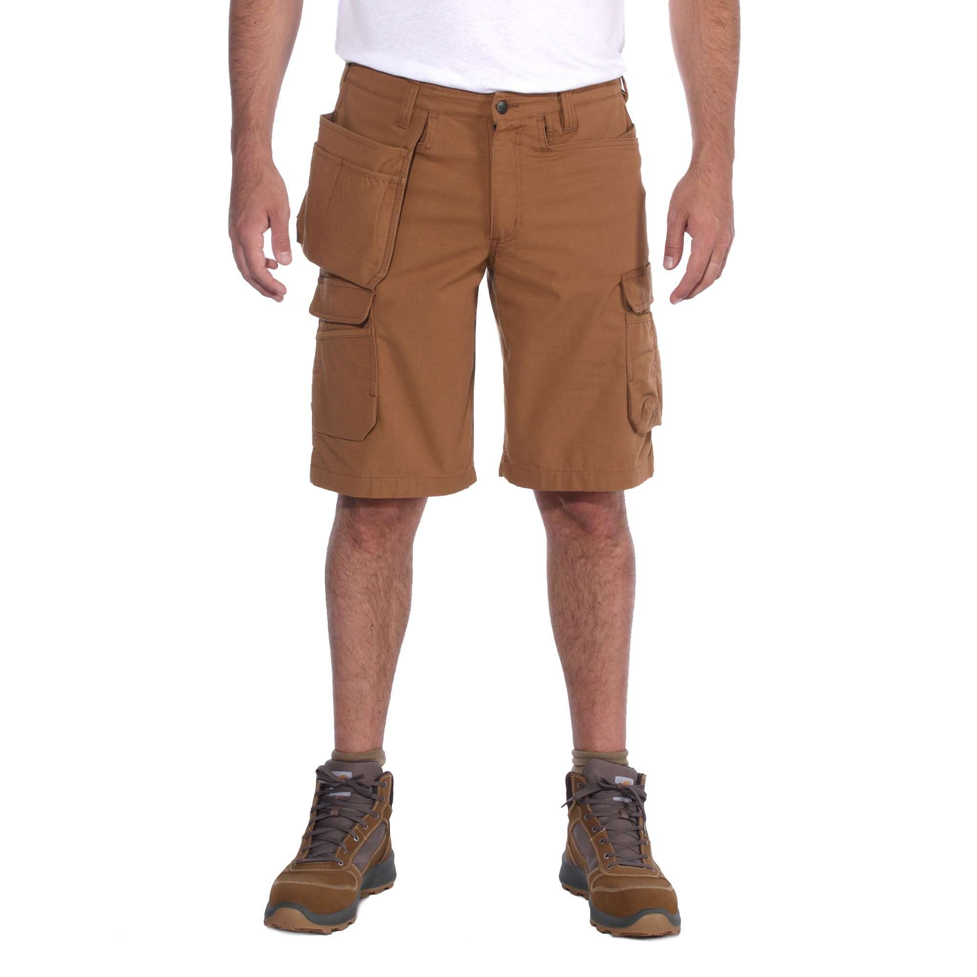 Cargo-Shorts Aus Ripstop-Material-Mit Lockerer Passform und Rugged Flex Stretch Ob harter Arbeitseinsatz oder Camping-Spaß – diese Männershorts mit Cordura®-Verstärkung an kritischen Verschleißpunkten wie den Taschenkanten ist jeder Herausforderung gewachsen. Durch den entspannten Schnitt und die richtige Menge an Stretch bietet sie eine komfortable Passform an Gesäß und Beinen. RELAXED FIT, 12 ZOLL BEININNENLÄNGE 8 oz/yd² - 271 gsm 59% Cotton/39% Polyester/2% Elastane Stretch Ripstop Rugged Flex® - Erleichtert die Bewegung Sitzt an der Taille Zwei Cordura®-verstärkte abgesetzte Taschen vorne, extra kleine fünfte Geldtasche in der rechten abgesetzten Tasche Hammerschlaufe am rechten Bein Zwei Cordura®-gefütterte aufgesetzte Gesäßtaschen mit Cordura® Leistentaschenrand. Zwei angebrachte Holstertaschen vorne, gesteckt in die vorderen Notizbuch-Taschen mit zusätzlichem Stauraum Cargo-Blasebalgtasche am rechten Bein mit mehreren praktischen Taschen, Patte und Druckknopfverschluss, eine weitere Tasche am linken Bein mit extra sicherer Handytasche Dreifach gesteppte Hauptnähte Carhartt-Label auf Tasche genäht