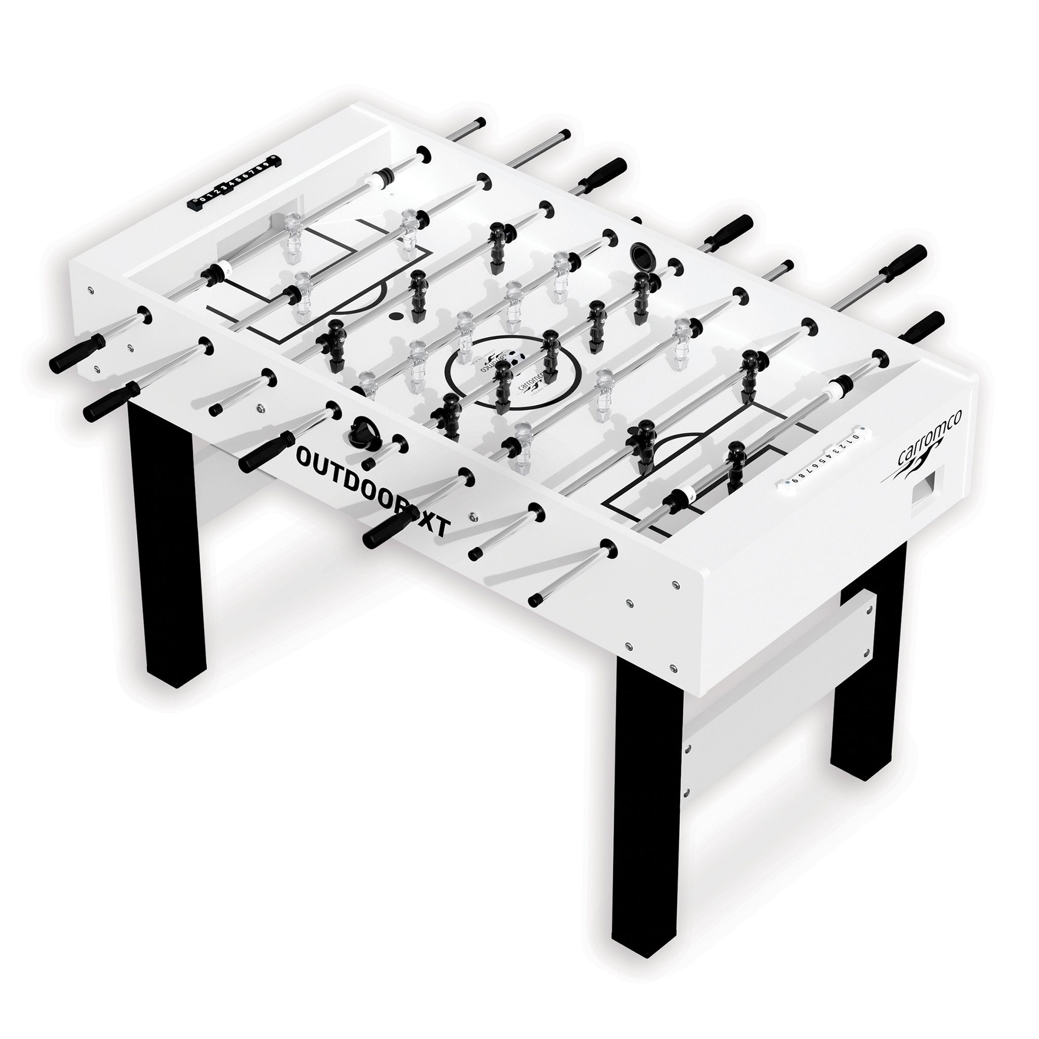 Der Outdoor-XT Fußballtisch von Carromco ist der erste witterungs- und UV-beständige Kicker für draußen zu einem erschwinglichen Preis. Все Bestandteile sind 100% wasserfest: die 16 mm breiten Edelstahlstangen mit Kunststoffgriffen, die Edelstahlbeine, die Kunststoffspieler und -bälle sowie der Spielkörper aus PVC-Hartschaumplatten.