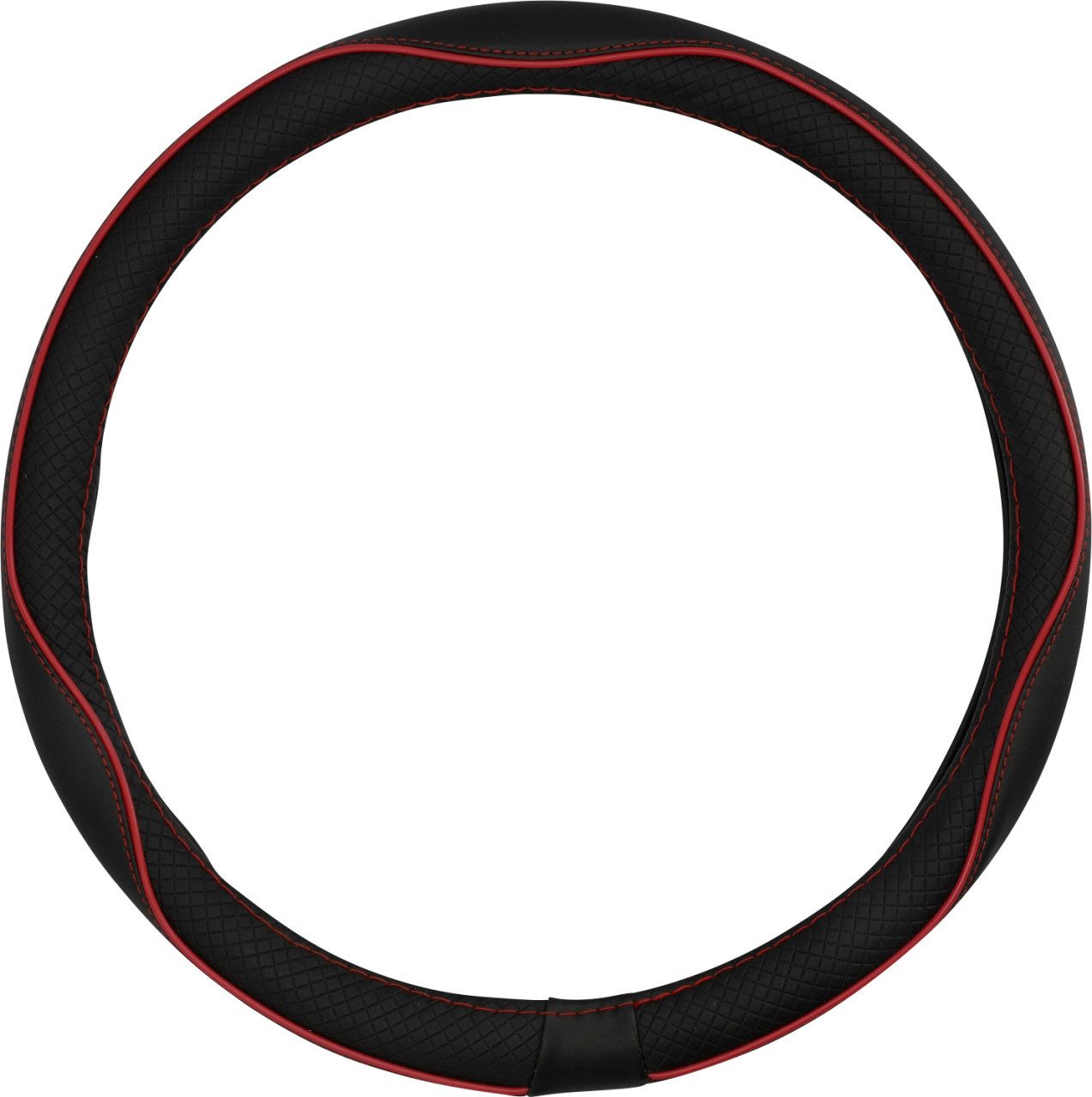 Produktdetails: Sportliche Optik in schwarz mit roten Ziernähten und -leisten | für alle Lenkräder zwischen 37 und 39 cm Durchmesser | rutschfeste und griffige Oberfläche | angenehm für längere Fahrten | langlebiger und robuster Lenkradbezug | aus weichem Mikrofaserleder | werkzeuglos mit wenigen Handgriffen zu befestigen | hitze- und kältebeständig |