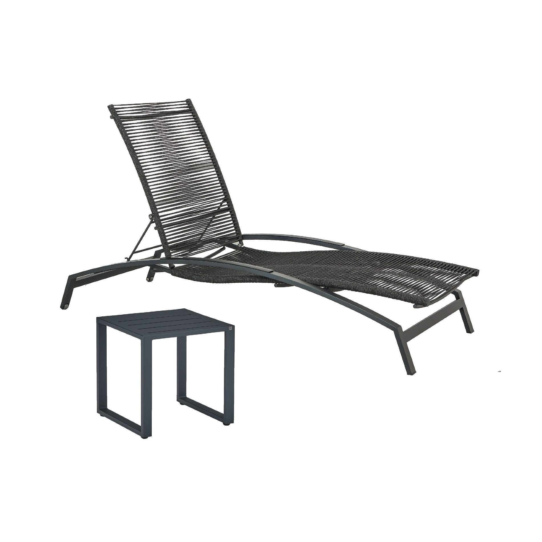 Lieferumfang | 1 (ein) Stück Sonnenliege "Mineo", Edelstahl anthrazit/Rope 1 (ein) Stück Beistelltisch "Macari" |
