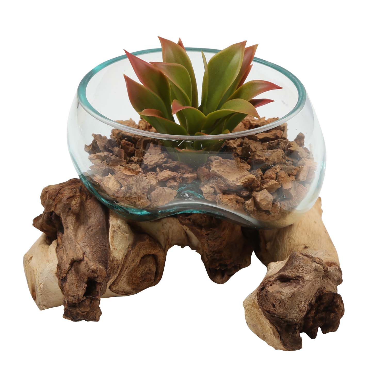 Glasschale auf Wurzelholz mit Unikat Charakter. Unsere prächtigen Glas Schale auf Wurzelholz entstehen aus Natur-Materialien in reiner Handarbeit. Der standfeste Sockel besteht aus nachhaltigen Wurzelholz. Das mundgeblasene Recycling Glas wird von Kunsthandwerkern im heißen Zustand auf das Wurzelholz Stück gesetzt und passt sich sogleich an die Unebenheiten und Vertiefungen der Wurzel perfekt an, dabei entsteht bei der Verbindung, eine schwarze Brandfärbungen auf dem Holz. Jede Glas-Vase auf Wurzelholz ist garantiert ein Unikat und ein echter Blickfang! Egal ob als Tischdeko auf dem Esszimmertisch, oder auf dem Sideboard und Couchtisch im Wohnzimmer, als Dekoration auf der Fensterbank im Büro und der Praxis, oder als Deko Highlight in Ihrer Gastronomie, Restaurant, Hotel, Kneipe oder Café, unsere Glasvasen auf Wurzelholz schaffen ein mediterranes Ambiente. Diese Wurzelholzvasen sind wahre Schmuckstücke, die auch ohne Dekoration, Kerzen und Pflanzen Blicke auf sich ziehen! Produktdetails: Glas Schale 15cm: Durchmesser 15cm - Höhe 8cm Fassungsverögen: ca. 0,5 Liter Höhe Gesamt: höhe ca 12 cm Gesamttiefe: ca. 20 bis 25 cm Gesamtbreite: ca. 20 bis 25 cm Gesamtgewicht ca. 1 bis 1,5 Kg Stil: Art Deco, Boho Chic, skandinavisch, modern, mediterran, Landhaus Anlass: dekorieren und originelle Geschenk-Idee für Muttertag, Valentinstag, Geburtstag & Weihnachten Besonderheit: Ein Naturprodukt – Form und Maße variieren! Pflegehinweis: Die Glas-Vase können Sie problemlos von der Wurzel abnehmen und wieder platzieren. Lieferumfang: Die Lieferung erfolgt ohne Pflanzen und Deko. Der Preis gilt für eine Glas Schale auf Wurzel Holz. Hinweis: Bitte beachten Sie, dass die Produktbilder lediglich zur Orientierung dienen und Ihre Wurzelholz Glas-Vase in Farbe, Form und Размер von den Beispielbildern und Angaben abweichen wird. Все Glasvasen aus Wurzelholz entstehen in reiner Handarbeit. Kleine Schönheitsfehler wie Luftblasen, Einschüsse und Verfärbungen im Glas und auf dem Wurzelholz entstehen durch den Herstellungsprozess und gehören einfach zum einzigartigen Charakter und Erscheinungsbild.