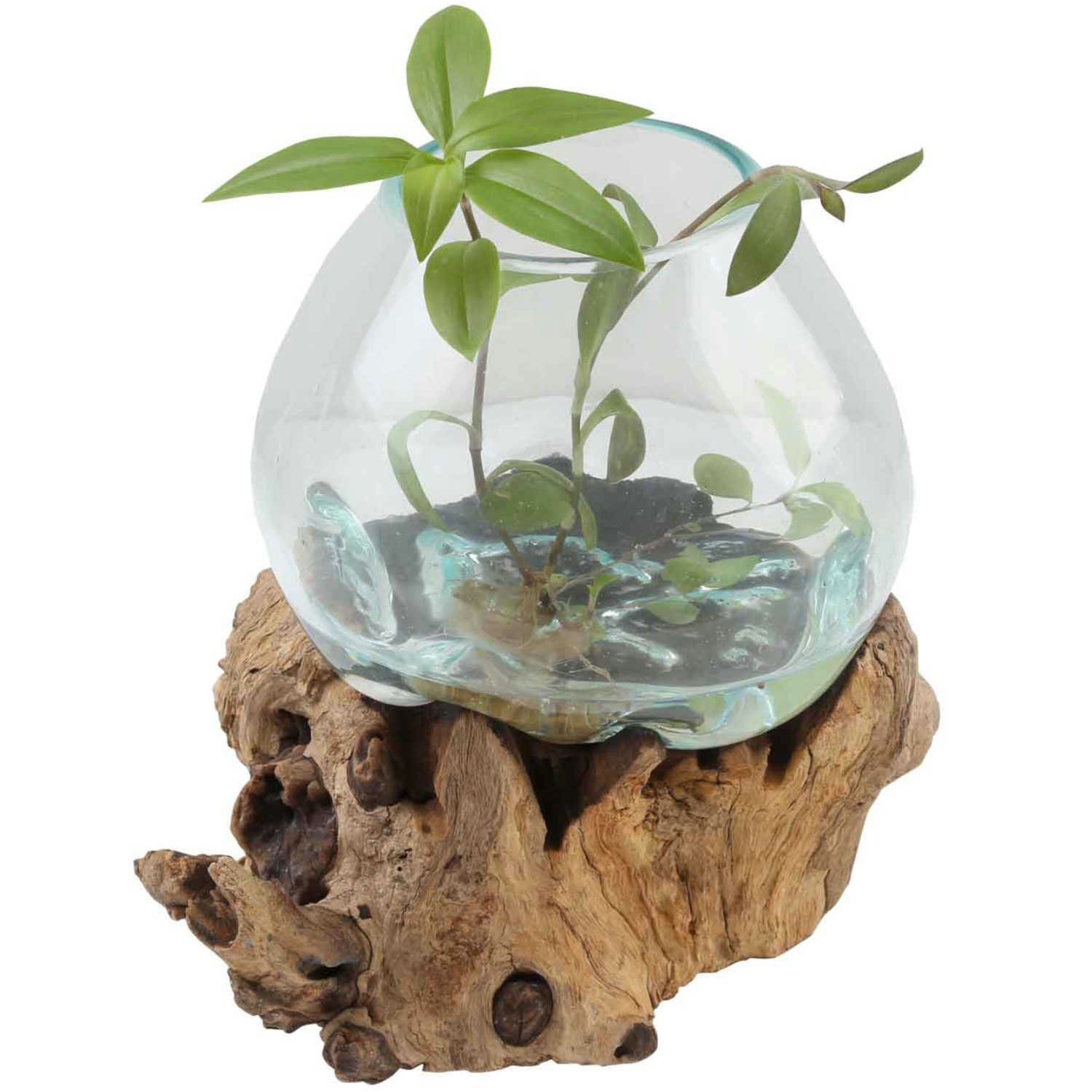 Einzigartige Glasvase auf Wurzelholz mit Unikat Charakter. Unsere prächtigen Glasvasen A20 auf Wurzelholz entstehen aus Natur-Materialien in reiner Handarbeit. Der standfeste Sockel besteht aus nachhaltigen Wurzelholz. Das mundgeblasene Recycling Glas wird von Kunsthandwerkern im heißen Zustand auf das Wurzelholz Stück gesetzt und passt sich sogleich an die Unebenheiten und Vertiefungen der Wurzel perfekt an, dabei entsteht bei der Verbindung, eine schwarze Brandfärbungen auf dem Holz. Jede Glasvase auf Wurzelholz ist garantiert ein Unikat und ein echter Blickfang! Egal ob als Tischdeko auf dem Esszimmertisch, oder auf dem Sideboard und Couchtisch im Wohnzimmer, als Fensterdeko im Büro und der Praxis, oder als Deko Highlight in Ihrer Gastronomie, Restaurant, Hotel, Kneipe oder Café, unsere Glasvasen auf Wurzelholz schaffen ein mediterranes Ambiente. Diese Wurzelholzvasen sind wahre Schmuckstücke, die auch ohne Dekoration, Kerzen und Pflanzen Blicke auf sich ziehen! Produktdetails: Breite: ca. 27 cm x Tiefe ca. 25 cm x Höhe: ca. 27 cm Glasvase: Durchmesser ca. 20 cm | Öffnung oben ca. 10-11 cm Material: recyceltes Glas und Wurzelholz (nachhaltig) Fassungsvermögen: ca. 2,6 Liter Gewicht: ca. 3,2 kg Stil: Art Deco, Boho Chic, skandinavisch, modern, mediterran, Landhaus Anlass: dekorieren und originelle Geschenk-Idee für Muttertag, Valentinstag, Geburtstag & Weihnachten Besonderheit: Ein Naturprodukt – Form und Maße variieren! Pflegehinweis: Die Glas Vase können Sie problemlos von der Wurzel abnehmen und wieder platzieren. Lieferumfang: Die Lieferung erfolgt ohne Pflanzen und Deko. Der Preis gilt für eine Glasvase aus Wurzelholz. Hinweis: Bitte beachten Sie, dass die Produktbilder lediglich zur Orientierung dienen und Ihre Wurzelholz Glas-Vase in Farbe, Form und Размер von den Beispielbildern und Angaben abweichen wird . Все Glasvasen aus Wurzelholz entstehen in reiner Handarbeit. Kleine Schönheitsfehler wie Luftblasen, Einschüsse und Verfärbungen im Glas und auf dem Wurzelholz entstehen durch den Herstellungsprozess und gehören einfach zum einzigartigen Erscheinungsbild.