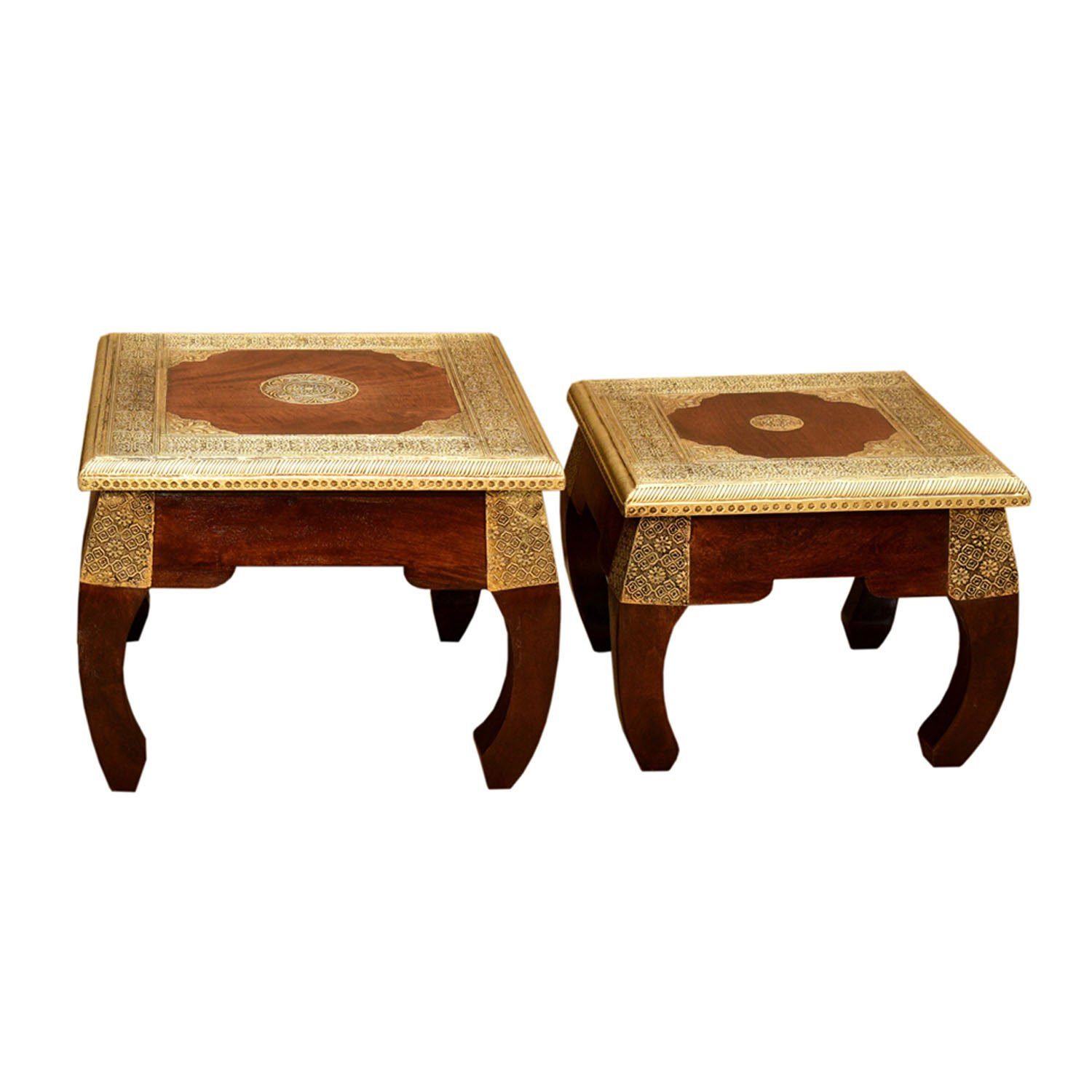 "Couchtisch Messing S & M". Opiumtische Messing S M als 2er Set aus Massivholz im indischen Stil. Diese Couchtische wurden in sorgfältiger Handarbeit in Indien gefertigt. Aufwendige Metallapplikationen zieren die Tischplatte. Die schwungvoll bearbeiteten Massivholztische sind ein dekoratives Highlight in jedem Wohnzimmer. Sie sind vielseitig verwendbar: als Couchtisch, Sofatisch, Beistelltisch, Wohnzimmertisch, Hocker oder Blumenständer. Все Möbel sind handgefertigt, dadurch können Maßabweichungen von 0,5 bis 2 cm entstehen. Die Modelle werden fertig montiert geliefert. Bei uns finden Sie eine große Auswahl an Handmade Opiumtische und handbemalten Beistelltische, Holztische und Teetische mit Handschnitzereien oder Metall- und Messing-Intarsien oder mit orientalischen marokkanischen Ornamenten versehen | klein, mittel oder groß, in der Farbe Weiß, Schwarz, Bunt, Goldfarbig, Silberfarbig oder Kupferfarbig aus Metall, Holz oder Messing. Marke: Casa Moro