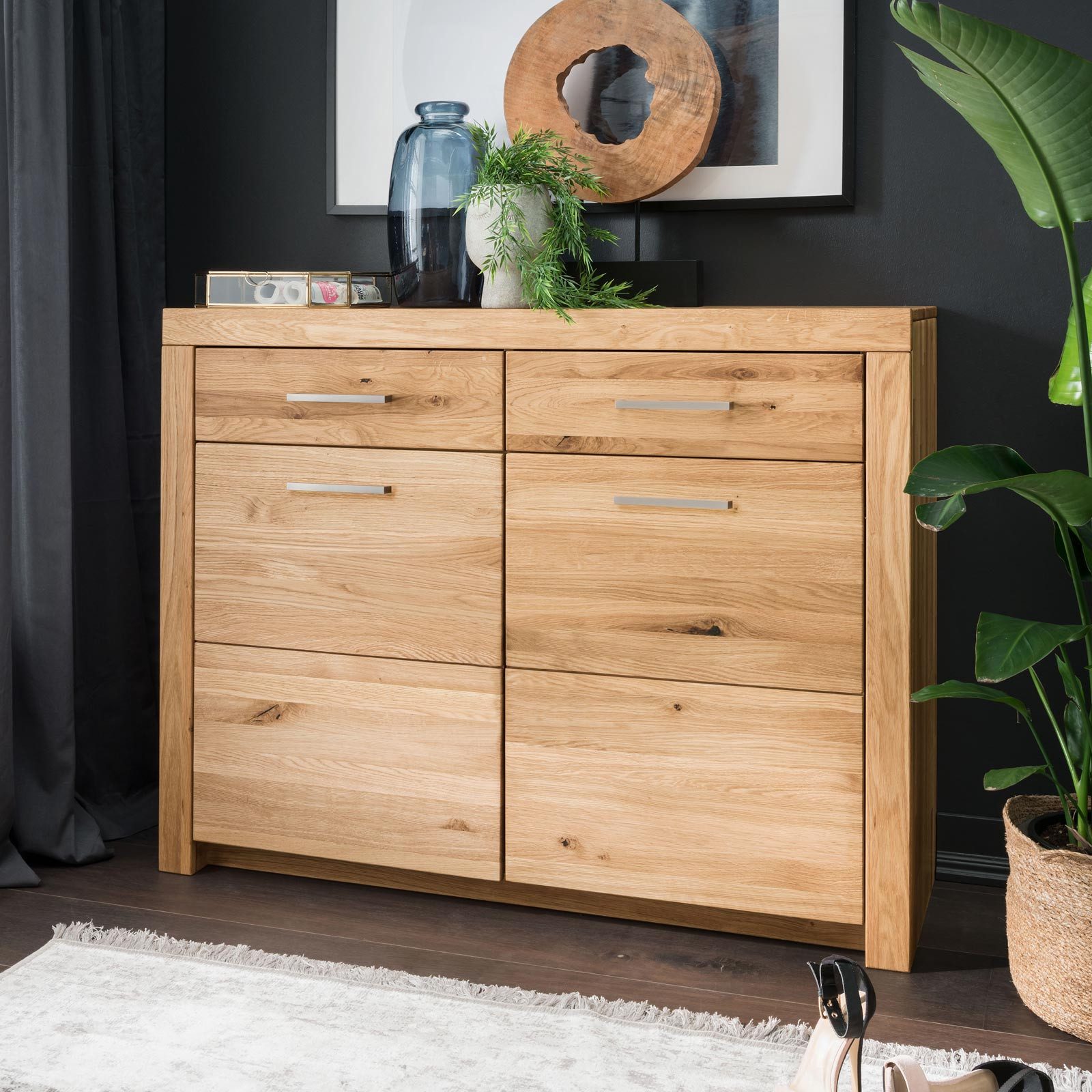 Das Sideboard Faro ist ein praktisches und gleichzeitig ästhetisch ansprechendes Möbelstück für jeden Wohnraum. Es besteht aus hochwertigem Wildeichenholz, das mit einer ölbehandelten Oberfläche versehen ist. Dadurch wird die natürliche Holzstruktur betont und die Farbe des Holzes aufgefrischt. Das Sideboard verfügt über zwei Holztüren und zwei Schubladen und bietet viel Stauraum für Geschirr, Gläser, Besteck oder andere Gegenstände. Die Türen und Schubladen lassen sich einfach öffnen und schließen, sind mit selbstschließender Soft Close Technik ausgestattet und sind mit vernickelten Griffen versehen, die dem Sideboard einen modernen Touch verleihen. Besonders schön an diesem Sideboard sind die abgerundeten Kanten, die dem Möbelstück eine weiche und harmonische Form geben. Dies verleiht dem Raum eine gemütliche Atmosphäre und macht das Sideboard zu einem Blickfang. Mit dem Sideboard Faro mit 2 Holztüren und 2 Schubladen aus massiver Wildeiche geölt erhalten Sie ein Möbelstück, das nicht nur funktional ist, sondern auch ein optisches Highlight in Ihrem Zuhause bildet. Durch die Verwendung von qualitativ hochwertigen Materialien und die Liebe zum Detail wird dieses Sideboard Ihnen lange Freude bereiten. Das Sideboard wird montiert geliefert.