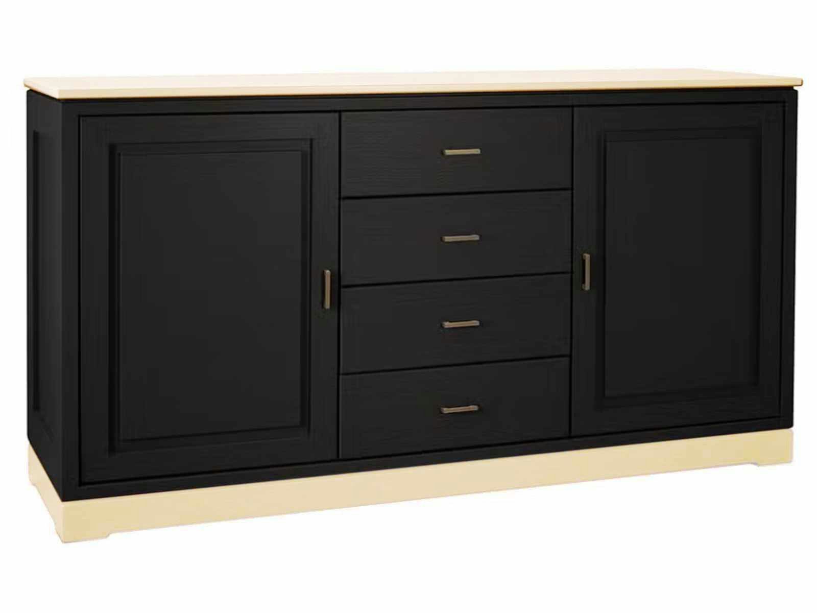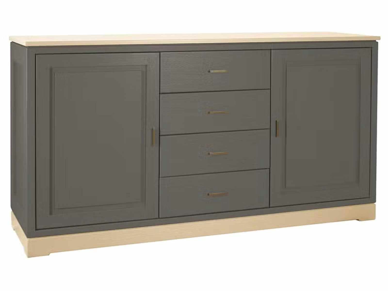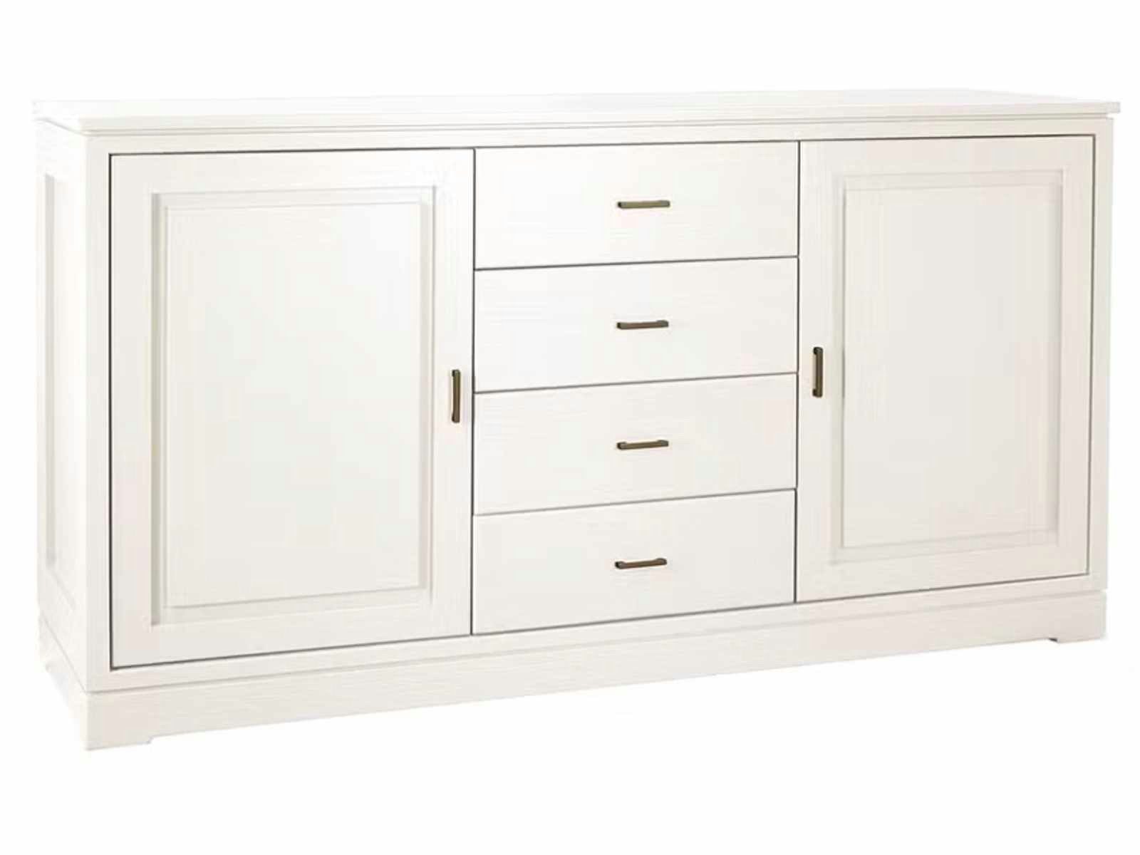 links und rechts hochwertige Türen mit glatter Füllung, dahinter je ein Holzeinlegeboden, mittig 4 Schubladen mit glatten Fronten