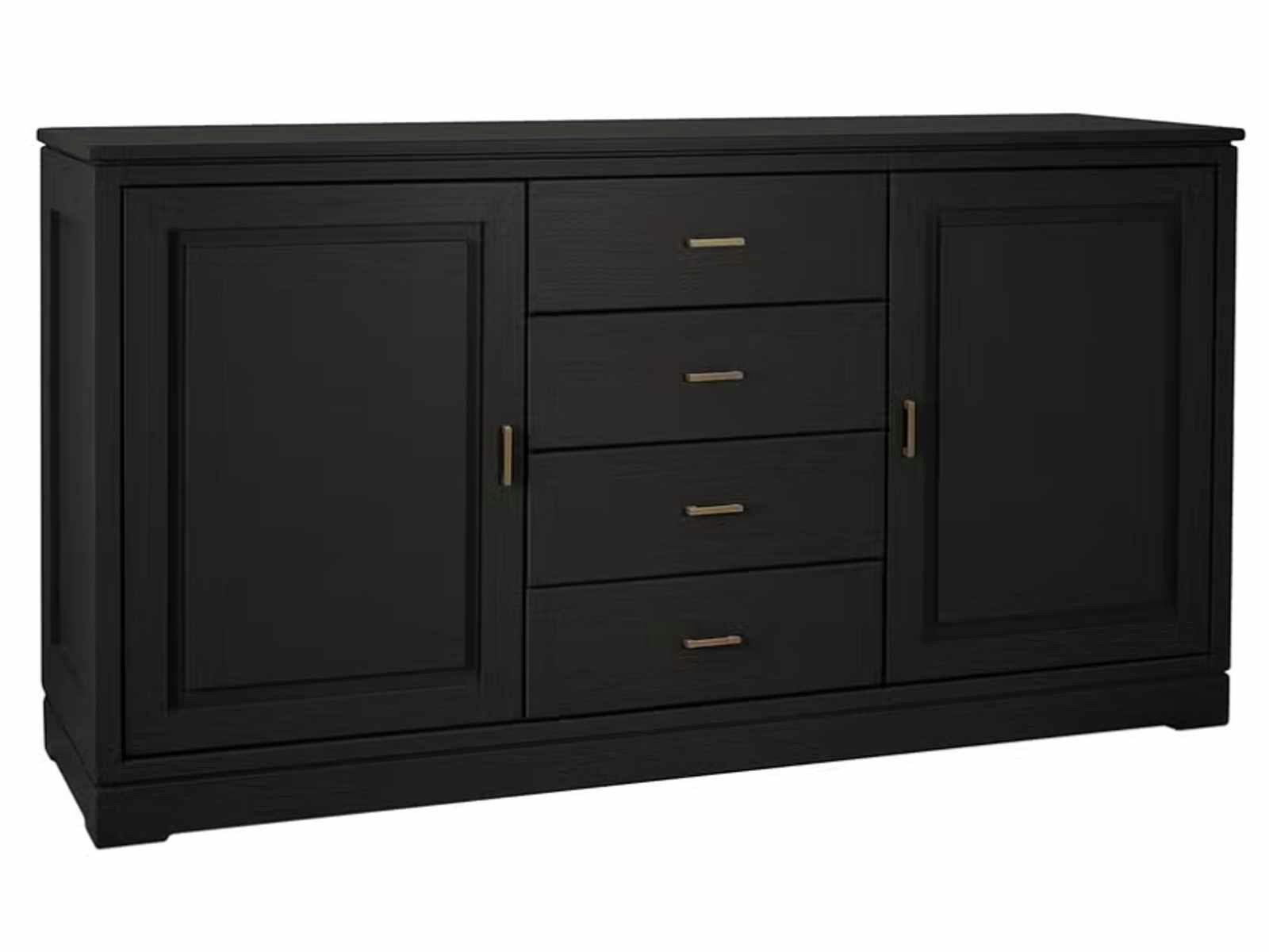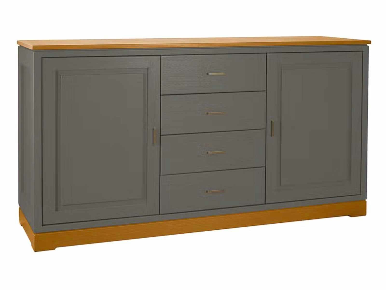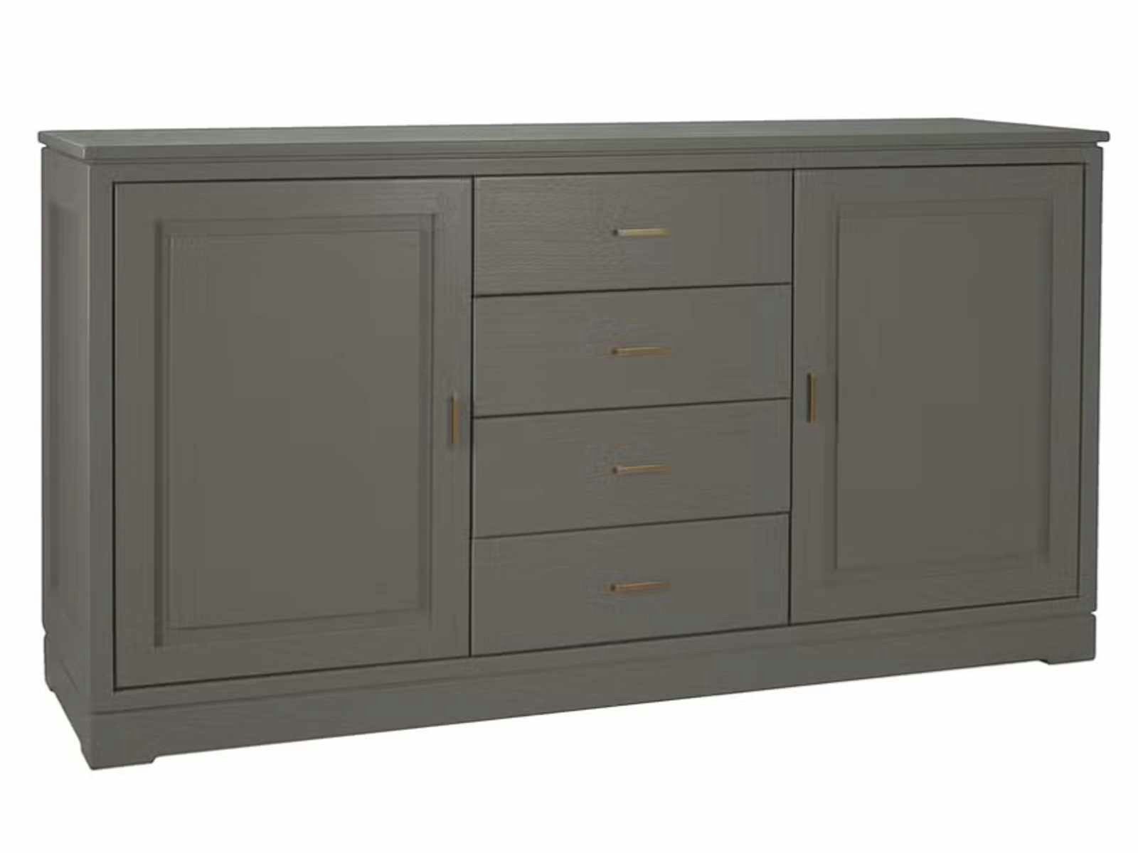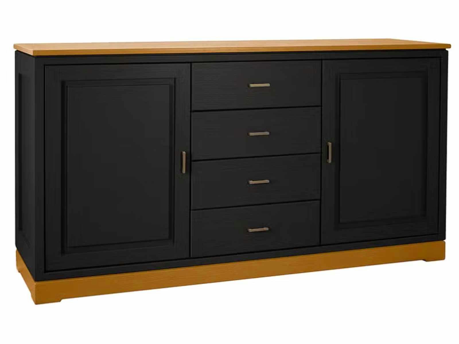 links und rechts hochwertige Türen mit glatter Füllung, dahinter je ein Holzeinlegeboden, mittig 4 Schubladen mit glatten Fronten