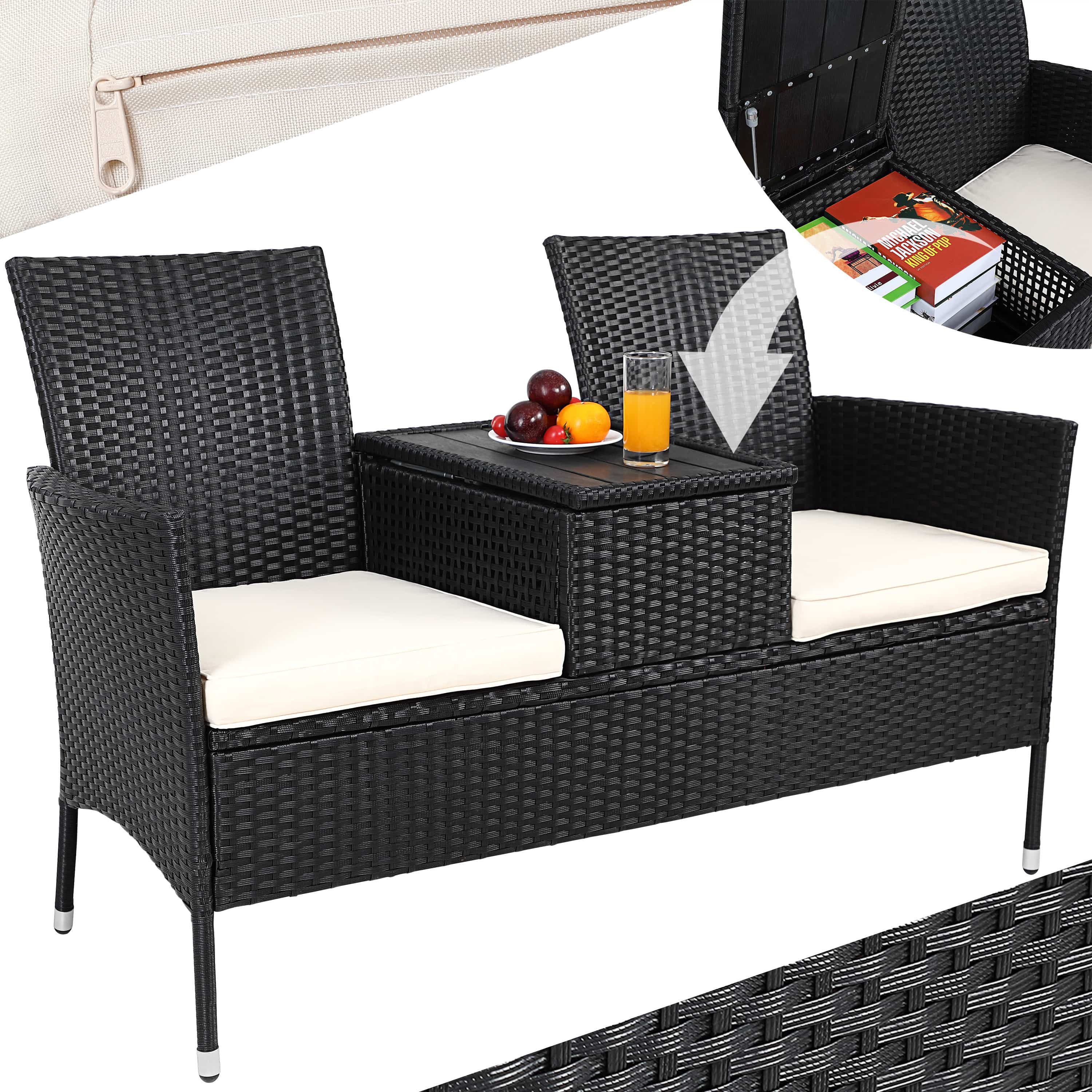 Eine 7 cm dicke Polsterung sorgt für angenehmen Sitzkomfort, während das robuste, pulverbeschichtete Stahlgestell mit bis zu 160 kg pro Sitz belastet werden kann. Die Bank in klassischem Schwarz und die eleganten, cremeweißen Sitzpolster fügen sich harmonisch in jedes Outdoor-Ambiente ein.