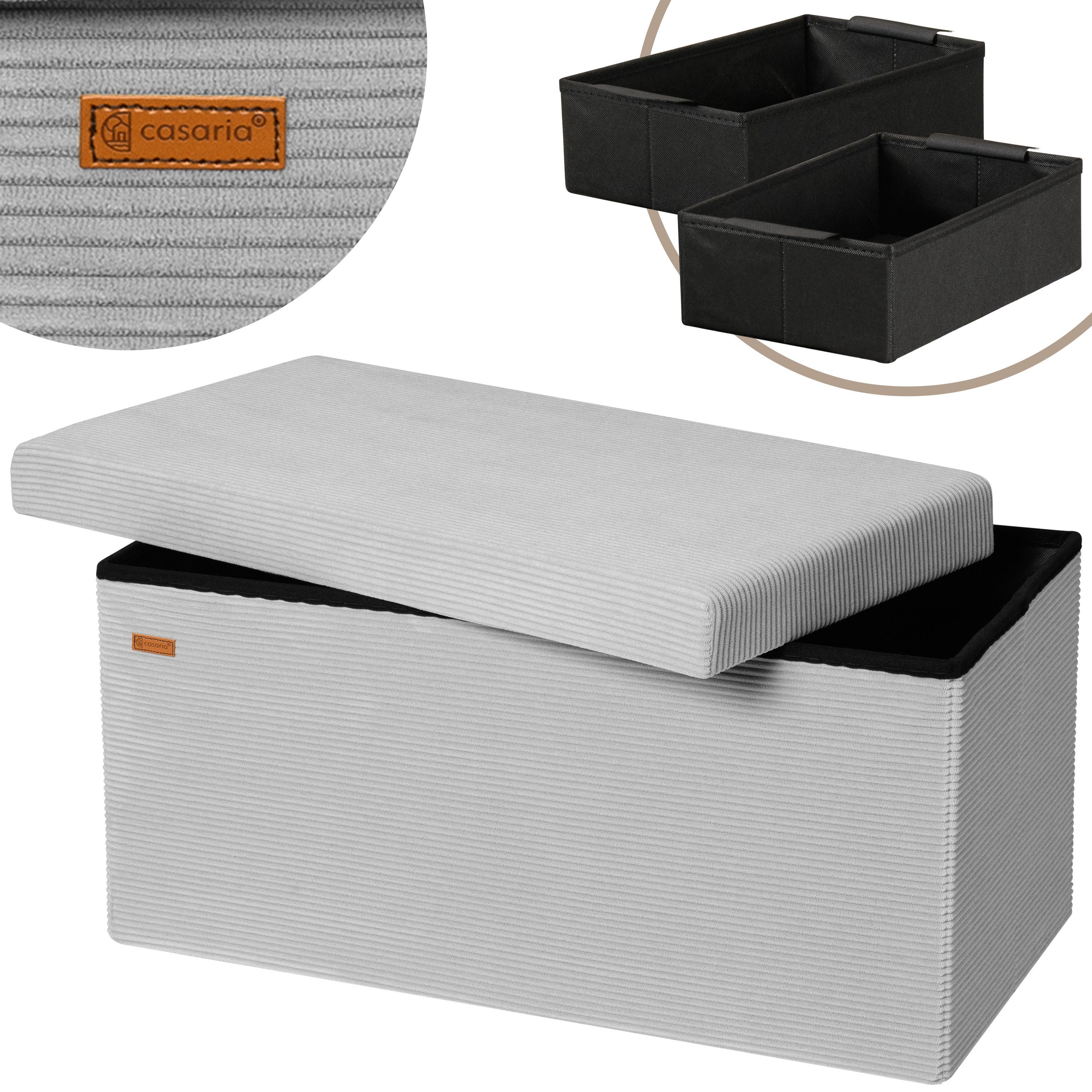 Die CASARIA® Sitztruhe aus weichem Cord vereint Stil und Funktionalität. In der Bank, die es in zwei Größen mit 100 oder 130L Volumen gibt, können Decken, Kissen und andere Utensilien verstaut werden. Der extra dicke, gepolsterte Deckel lädt zum gemütlichen Sitzen ein. Das stylische Design verleiht jedem Wohnbereich – ob Wohnzimmer, Schlafzimmer oder Flur – das gewisse Etwas. Du kannst zwischen den Farben Beige, Hellgrau und Anthrazit wählen.