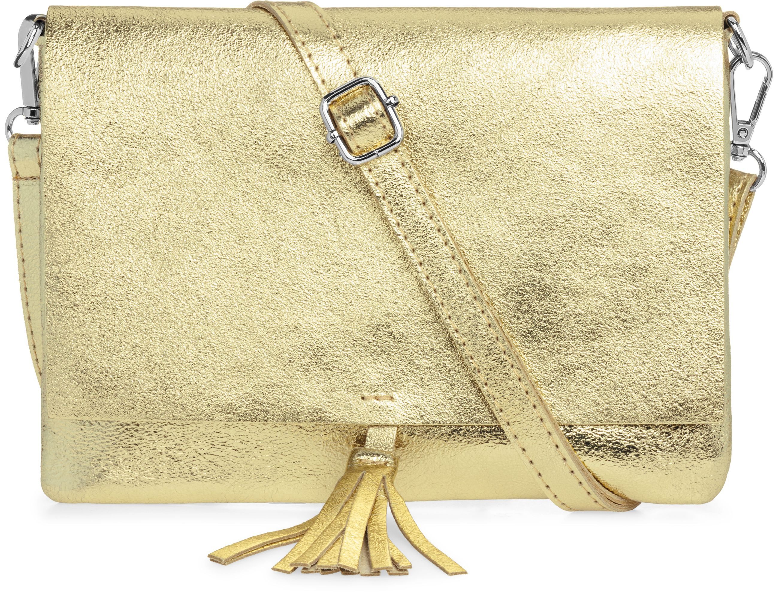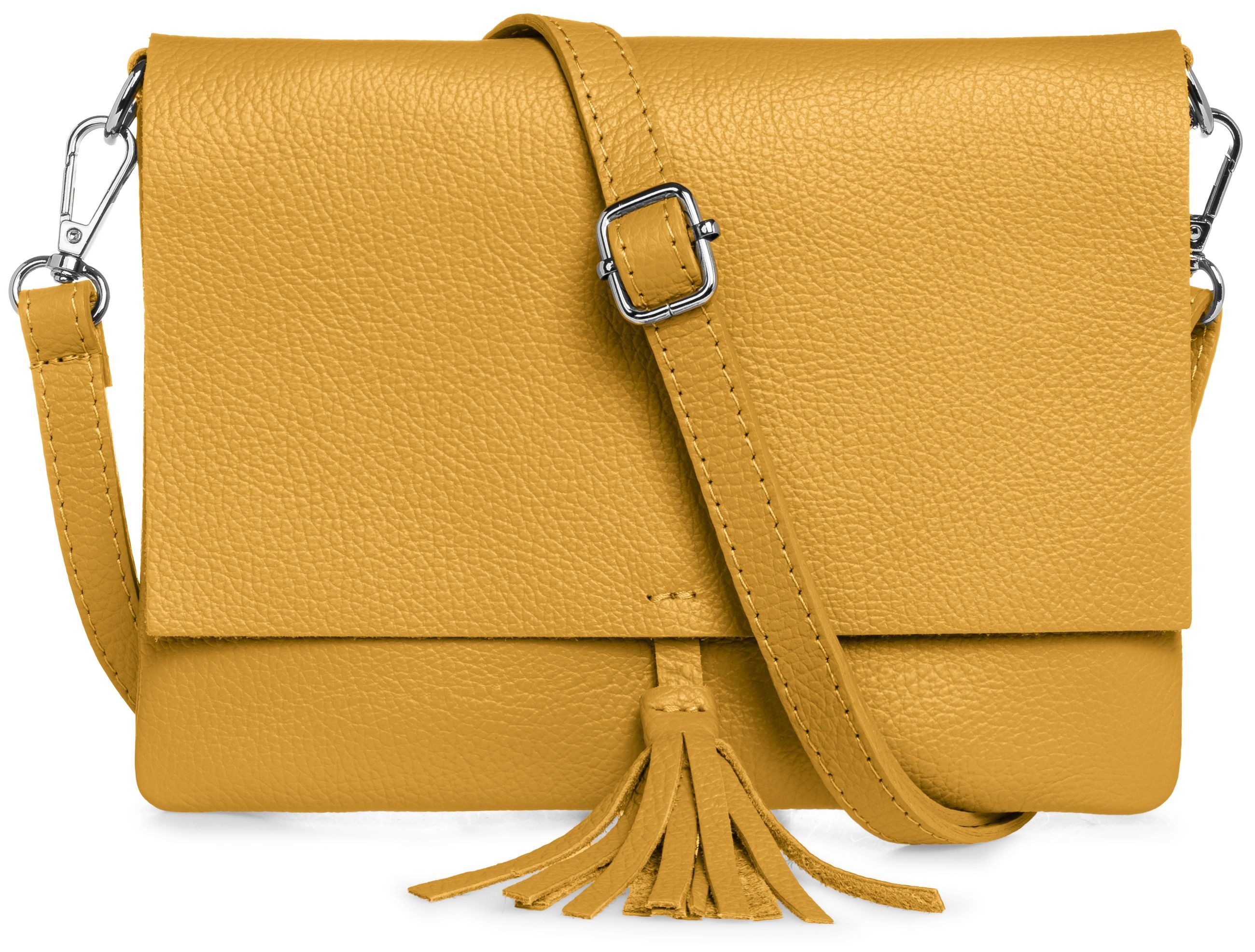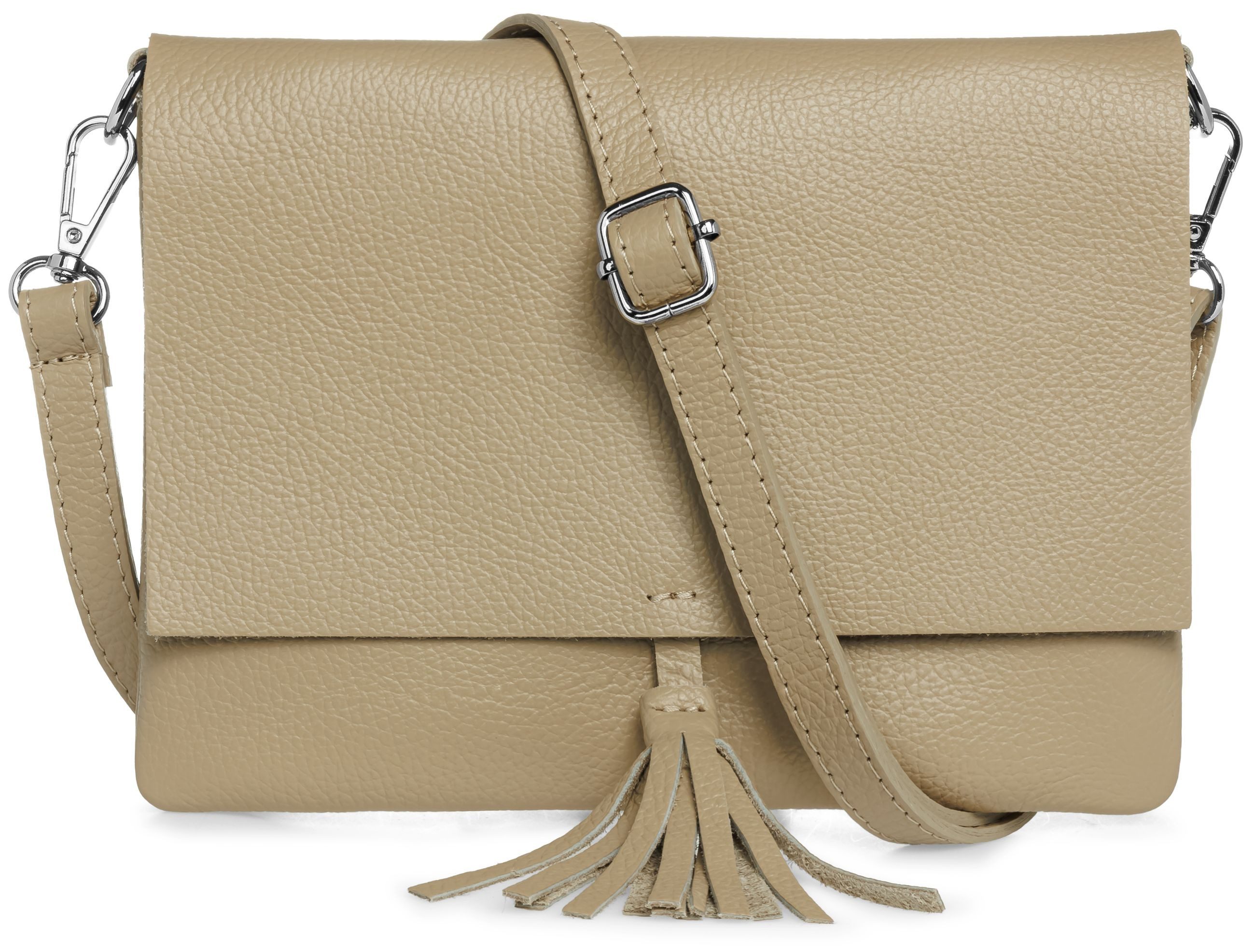 Unsere stilvolle Clutch aus hochwertigem, italienischem Dollaro-Leder vereint zeitlose Eleganz mit praktischer Funktionalität. Das fein genarbte Leder verleiht der Tasche eine natürliche Ausstrahlung und sorgt für einen angenehm weichen Griff. Ob als Clutch, Umhängetasche oder Abendtasche - sie ist ein vielseitiger Begleiter für Alltag und besondere Anlässe. Mit einer Размер von ca. 22,5 x 16 x 2 cm bietet die Tasche ausreichend Platz für deine Essentials wie Smartphone, Schlüssel, kleine Geldbörse oder Make-up. Der Innenraum ist mit einem edlen Stofffutter ausgekleidet und enthält ein praktisches Sicherheitsfach mit Reißverschluss, ideal für Karten oder andere wichtige Kleinigkeiten. Der markante Überschlag mit darunterliegendem Reißverschluss schützt deine Wertsachen zuverlässig und verleiht der Tasche ihre charakteristische, schlichte Form. Ein besonderes Detail: die dekorative Quaste am unteren Ende des Überschlags - sie rundet das Design stilvoll ab und setzt einen dezenten, modischen Akzent. Dank des abnehmbaren, stufenlos verstellbaren Schulterriemens (ca. 70–125 cm) lässt sich die Tasche flexibel als Clutch oder Umhängetasche tragen - je nach Anlass und Outfit. Mit einem Gewicht von nur ca. 280 g (inkl. Gurt) bleibt sie angenehm leicht und bietet gleichzeitig alltagstauglichen Komfort.