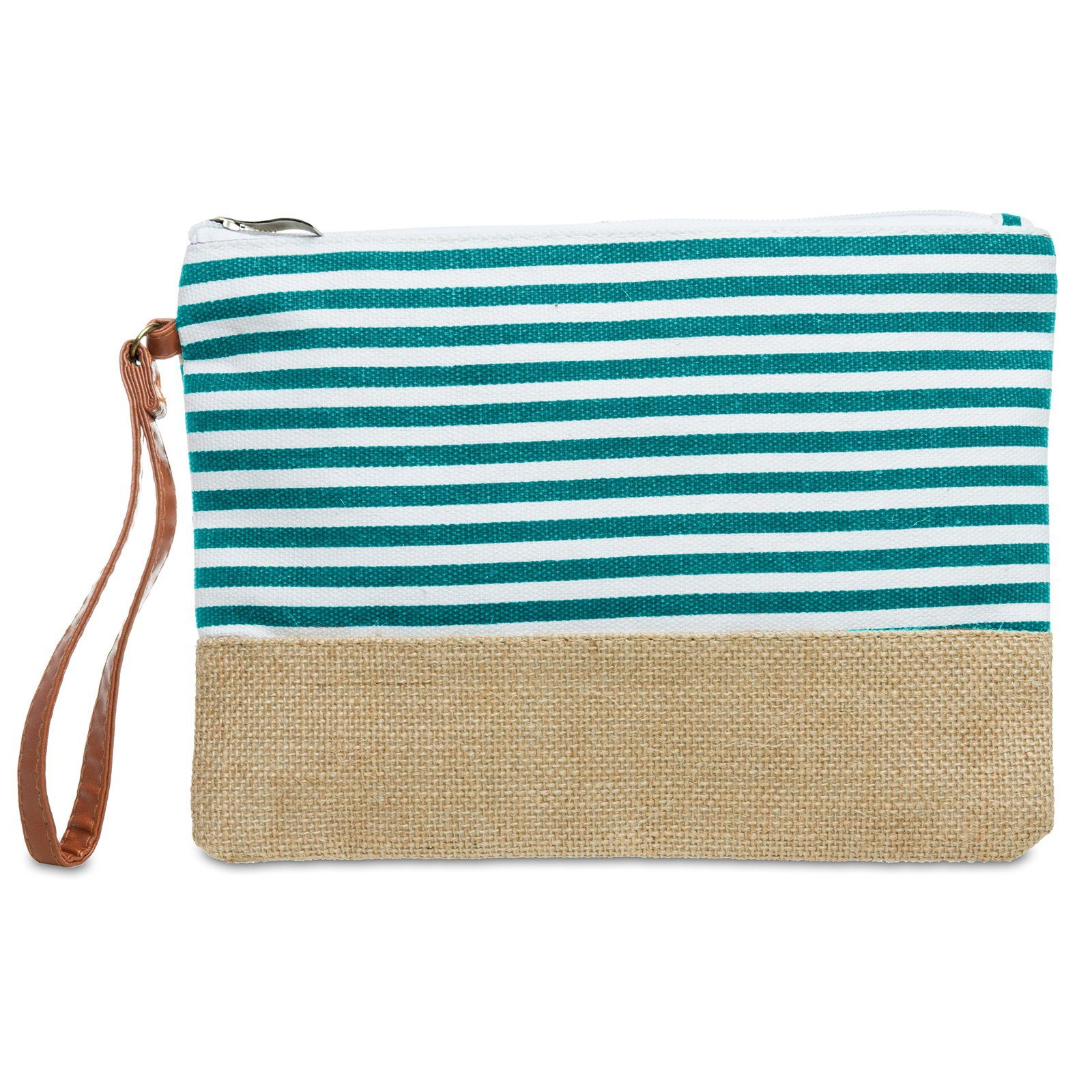 Stylische Sommer Damen Clutch Handgelenkstasche mit Streifen Print aus natürlichem Jute Material. Diese Tasche ist perfekt für die Party unter lauschigem Sommerhimmel. Aber auch als Kosmetiktasche, XL Handytasche oder Mini Strandtasche für die wichtigsten Utensilien wird Ihnen die Tasche beste Dienste leisten. Das natürliche Obermaterial ist ideal für den Sommer und passtl zum lässigen Leinen Baumwoll Vintage Look. Die fest angebrachte Handschlaufe ist aus angenehmem weichem Kunstleder. Geschlossen wird die Clutch mit einem oben angebrachten Reißverschluss. Maße ca.: L x H x B ca. 27 x 19 x 1,5 cm. Material: Jute, Stoff (Polyester). Caspar Fashion.