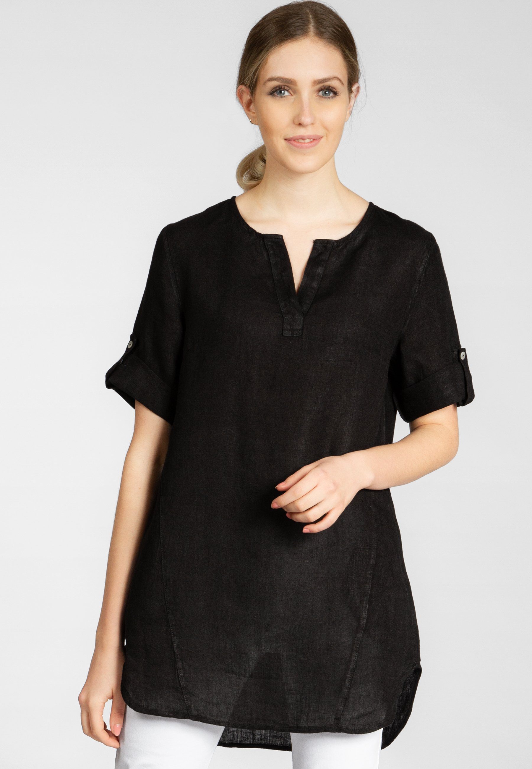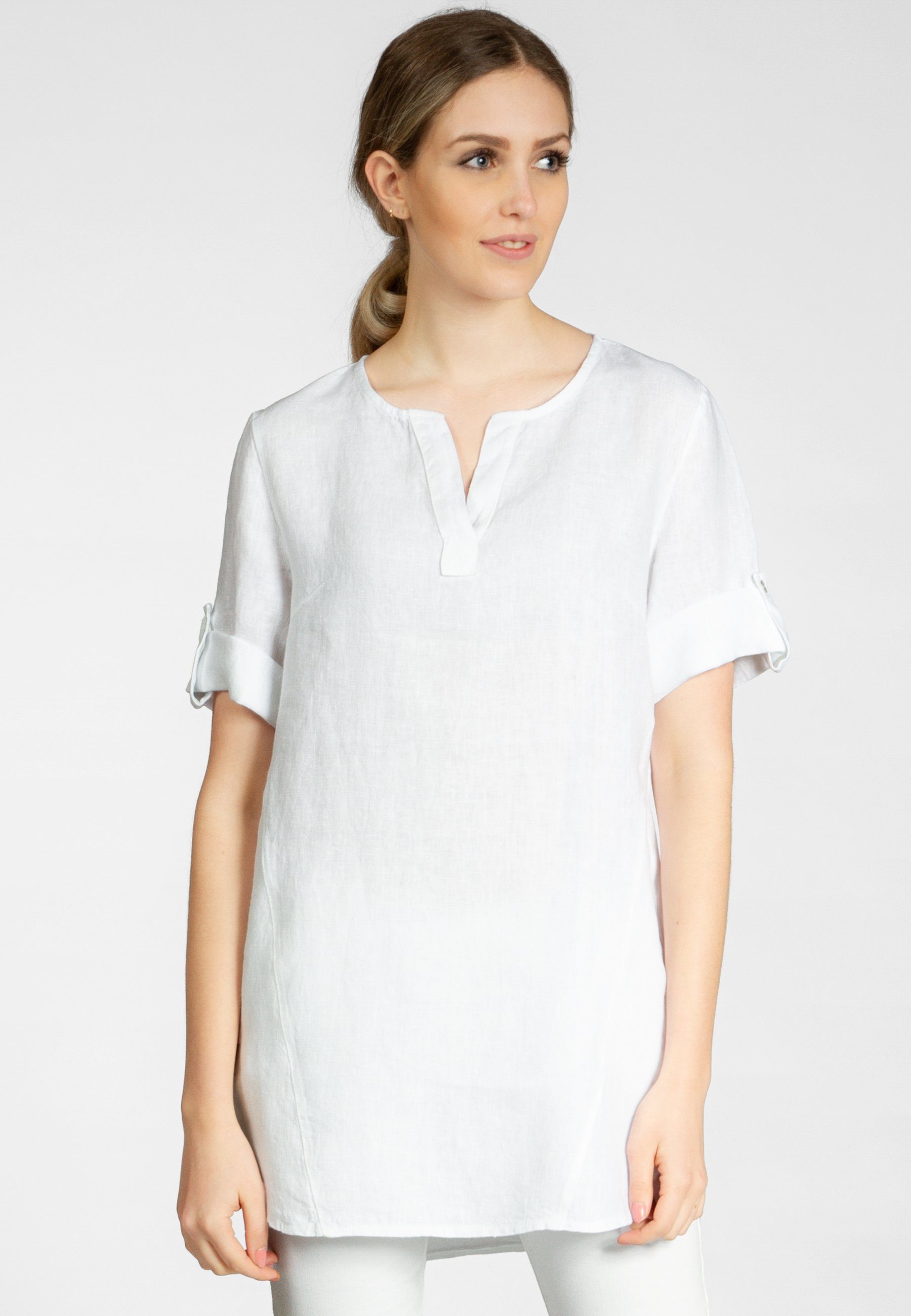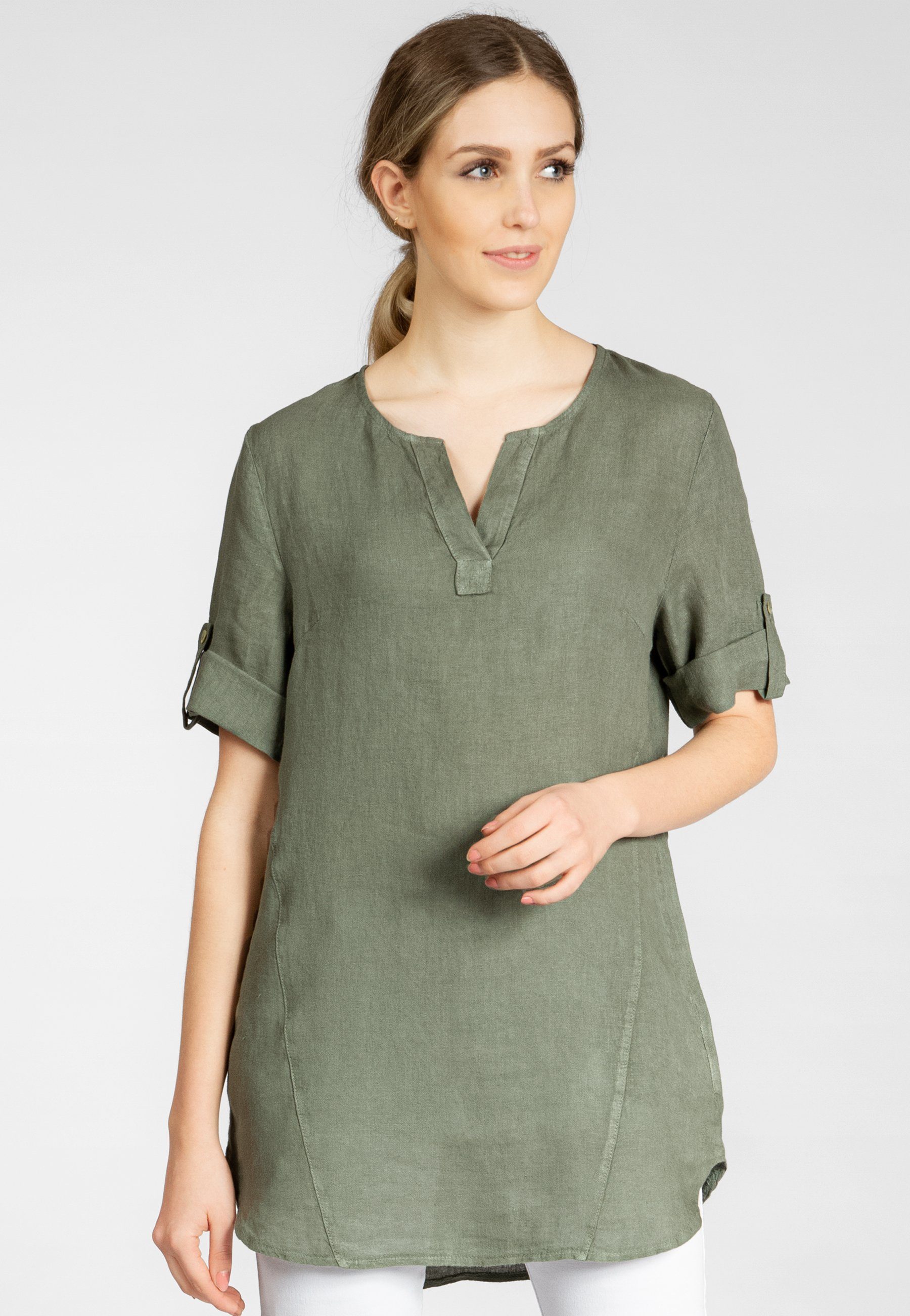 Super angenehm zu tragende, sportlich elegante und lange Shirtbluse aus Leinen. Der gerade Schnitt dieser Longbluse ist schlicht und dennoch hochwertig elegant und lässig. Die Ärmel sind durch ein kleines Band mit Perlmuttknopf zu einem Halbarm hochgebunden. Besonders lässig wirkt der durch eine Materialdopplung akzentuierte und verstärkte V-Ausschnitt. Der luftig leichte, natürliche Leinenstoff ist besonders auch im Sommer sehr angenehm zu Tragen. Sie werden dieses neue Teil lieben... Material: 100% Leinen. Pflegehinweis: Maschinenwäsche bei 30°C. Caspar Fashion - Made in Italy.