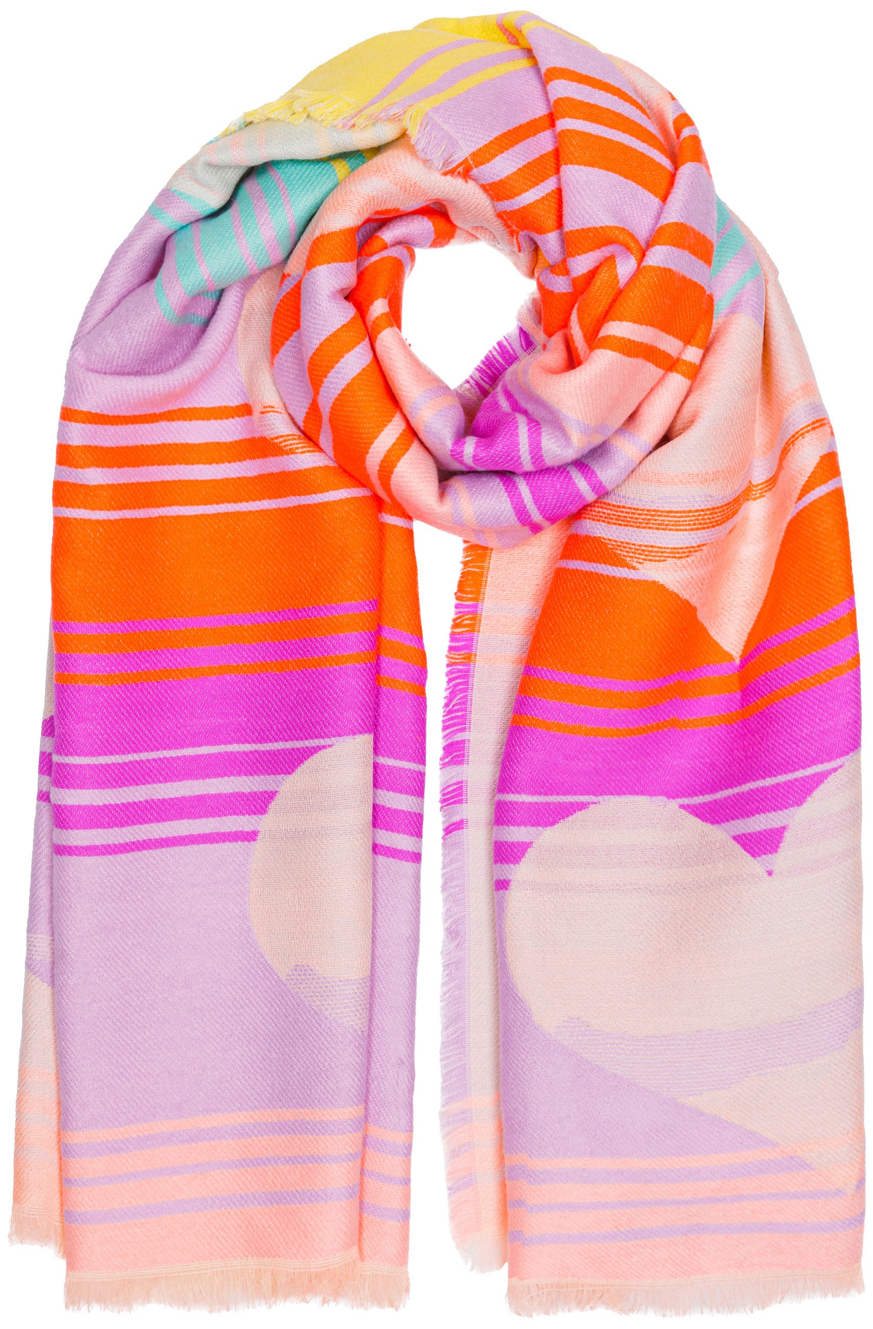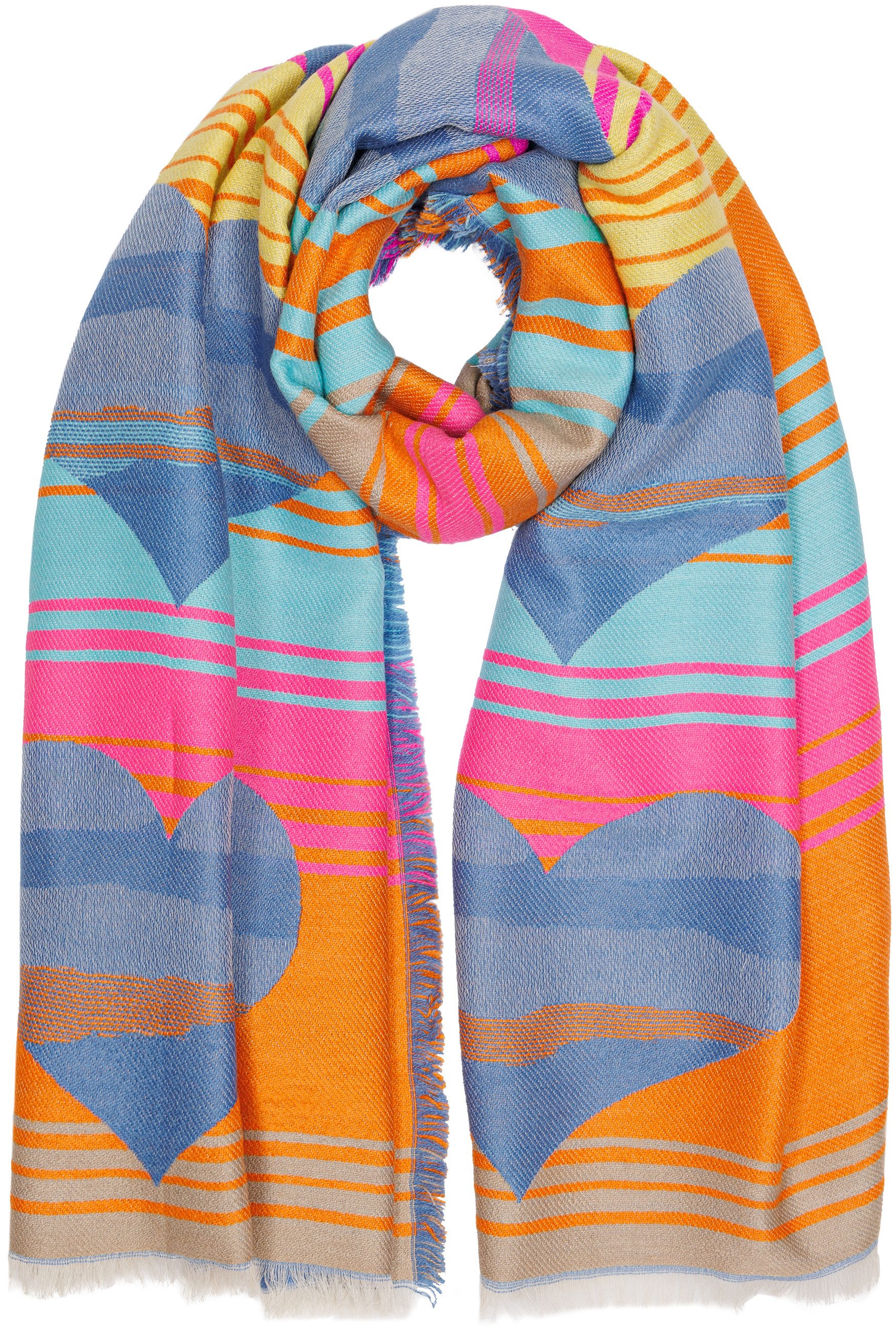 Dieser farbenfrohe Schal im Herz-Muster ist mehr als nur ein Accessoire – er ist ein Ausdruck von Lebensfreude und Eleganz. Mit seinem verspielten Design und der angenehm weichen Textur bringt er Frische und Raffinesse in deinen Look.