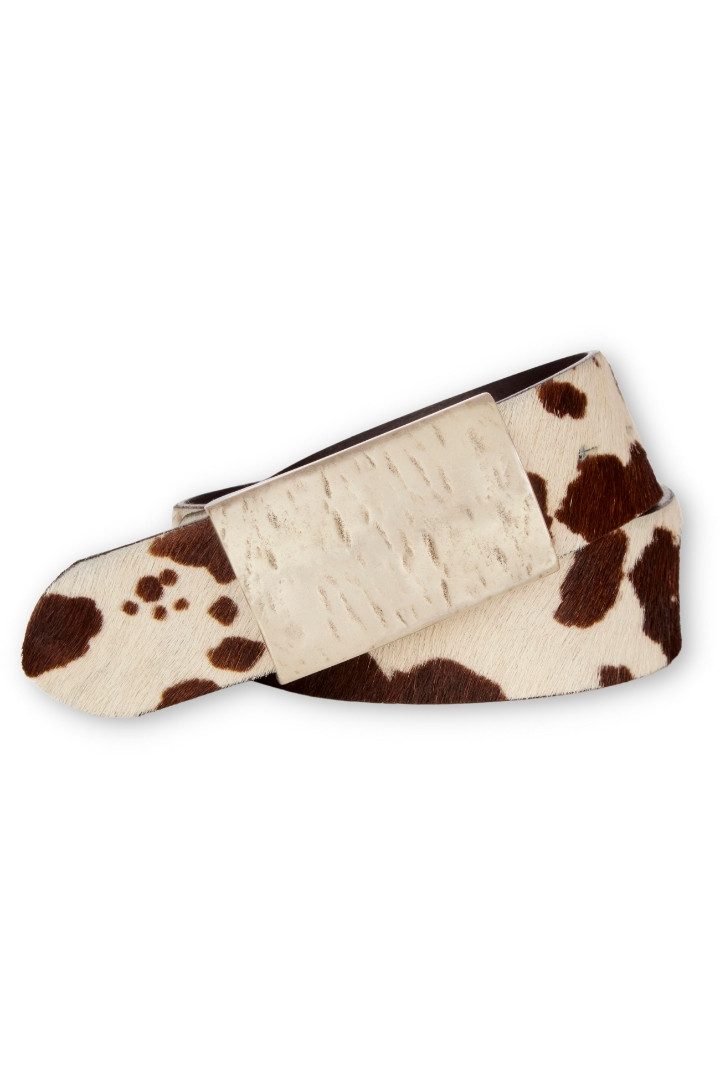 Dieser kernig-fetzige Trachtengürtel besteht aus zünftigem Leder mit Fell-Besatz und ist im Kuhflecken-Look bedruckt. Die massive, schlichte Koppelschließe in Altsilber hat einen antik anmutenden Touch. Das krachige Design stammt von der Marke Der Trachtler by Cassandra und wird in Bayern handgefertigt. Dieses schicke Stück Kuhhaut passt stylisch zu Lederhose und Trachtenjeans.