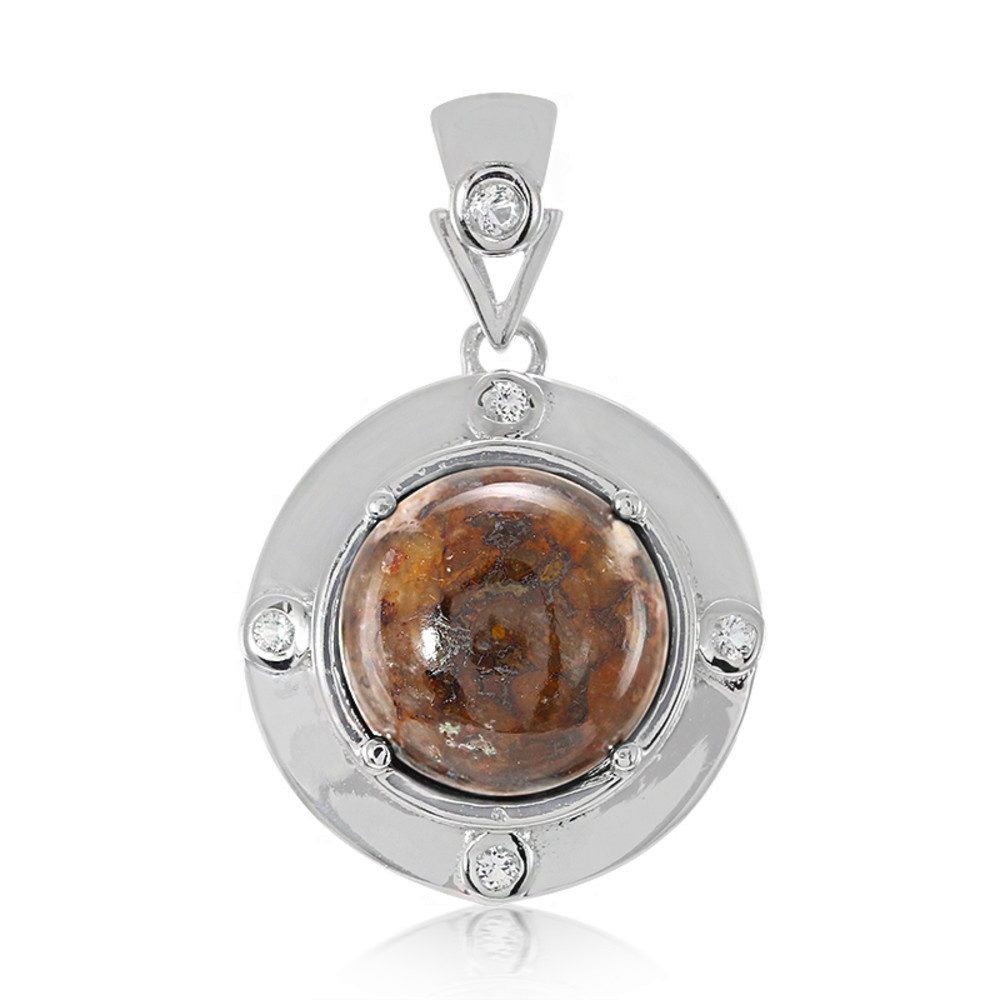 Entdecken Sie die uralte Schönheit dieses Silberanhängers aus Dinosaurierquarz mit einem runden Cabochon von 4,69 Karat aus den USA, der von einem brasilianischen weißen Topas akzentuiert wird. Eingefasst in elegantes 925er Sterlingsilber, kombiniert dieses Stück Raffinesse mit einem Hauch von Erdgeschichte. Es ist ideal für den täglichen Gebrauch oder für besondere Anlässe und passt sowohl zu legeren als auch zu formellen Outfits.