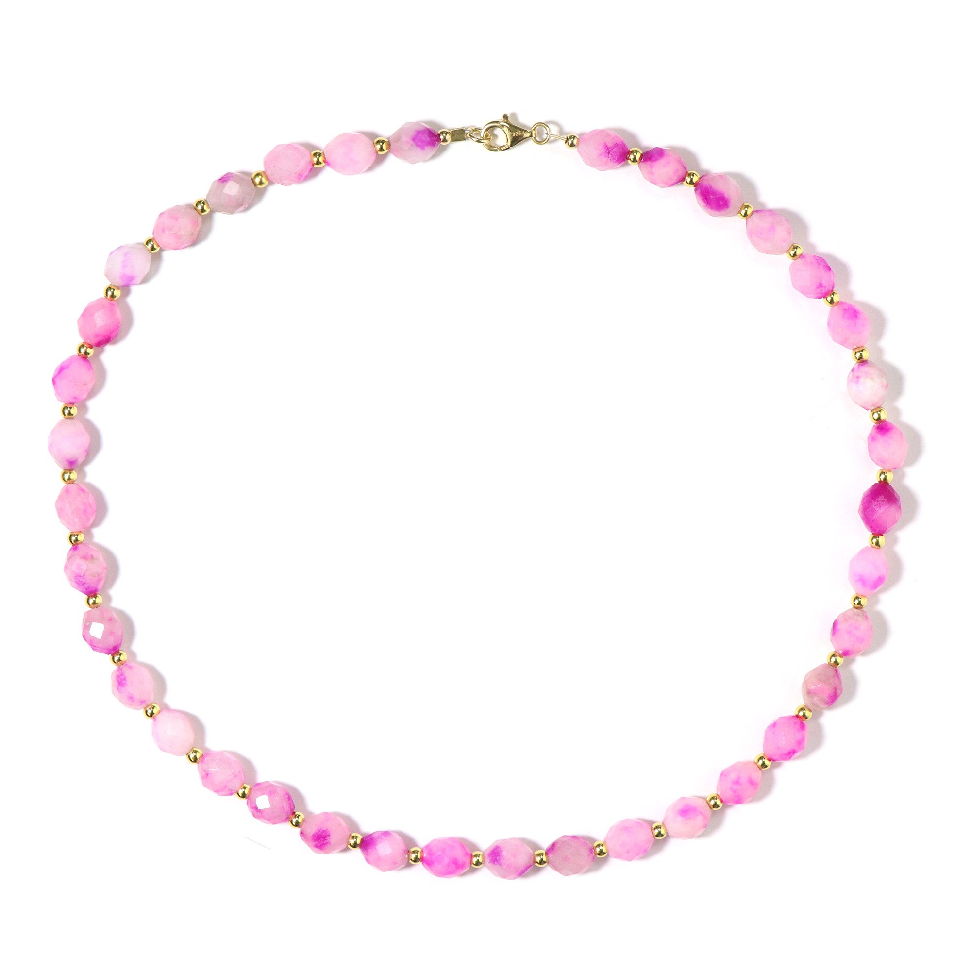 Die Lilien-Quarz-Silberhalskette aus unserer Kollektion ist ein elegantes Schmuckstück, das besonders Erstkäufer begeistert. Die aus Brasilien stammenden, facettierten Lilienquarz-Perlen bestechen durch ihre lebendige rosafarbene Nuance und sind meisterhaft mit goldenen Hämatitperlen aus den USA kombiniert. Das vergoldete 925er Sterlingsilber verleiht der 45 cm langen Kette eine luxuriöse Note. Für Kenner bietet die Kombination aus verschiedenen Edelsteinen und der präzise facettierte Schliff eine faszinierende Tiefe und Brillanz. Perfekt als Highlight für elegante Abendgarderoben oder als auffälliges Accessoire zu schicken Tagesoutfits.