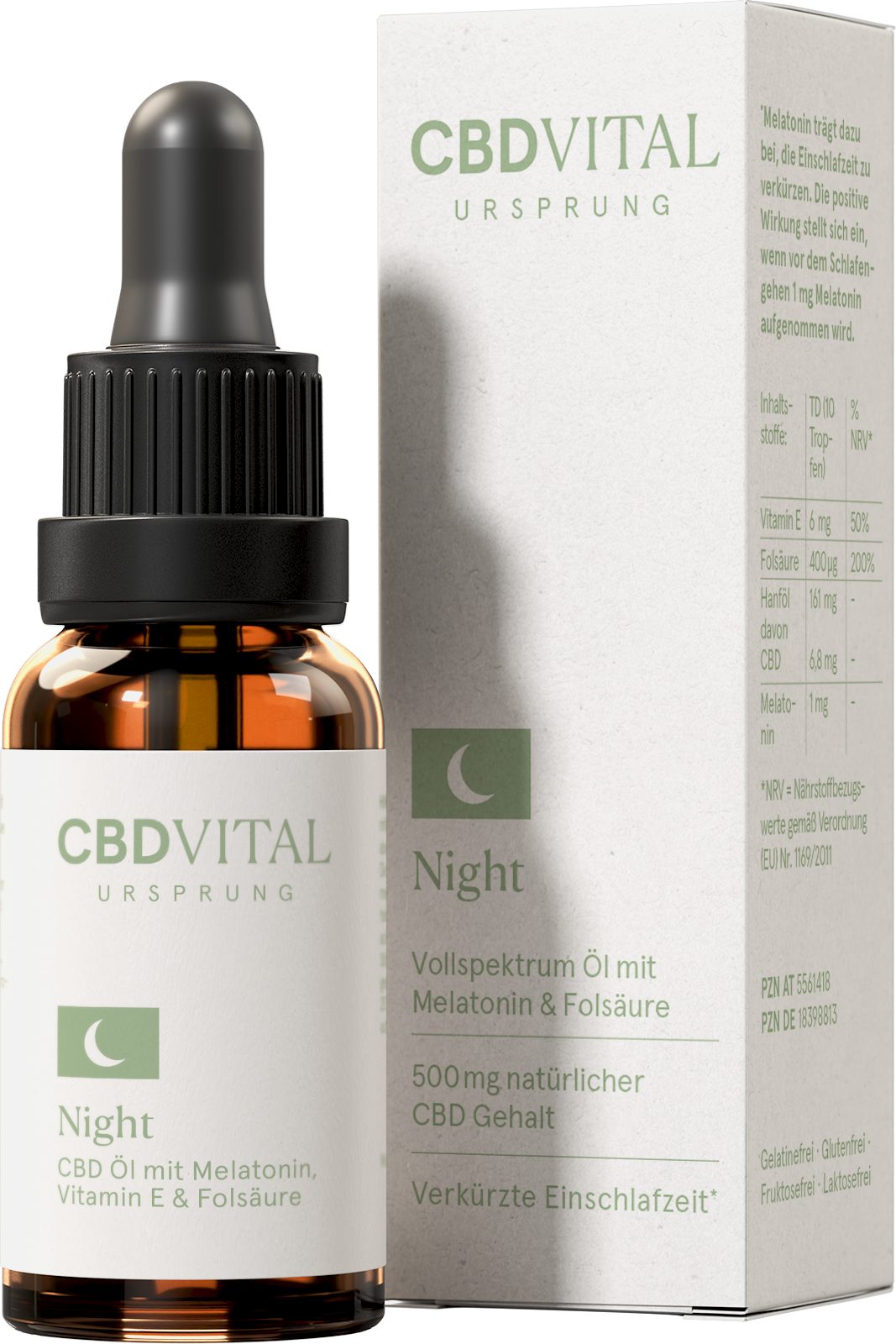 Die CBD Ursprung Night-Tropfen mit Melatonin, Folsäure und Vitamin E sorgen für eine angenehme Nachtruhe und dienen als nutritive Unterstützung zum schnelleren Einschlafen. Die ölige Lösung einfach nach Anwendungsempfehlung direkt in den Mund tropfen. Der Geschmack ist angenehm mild.