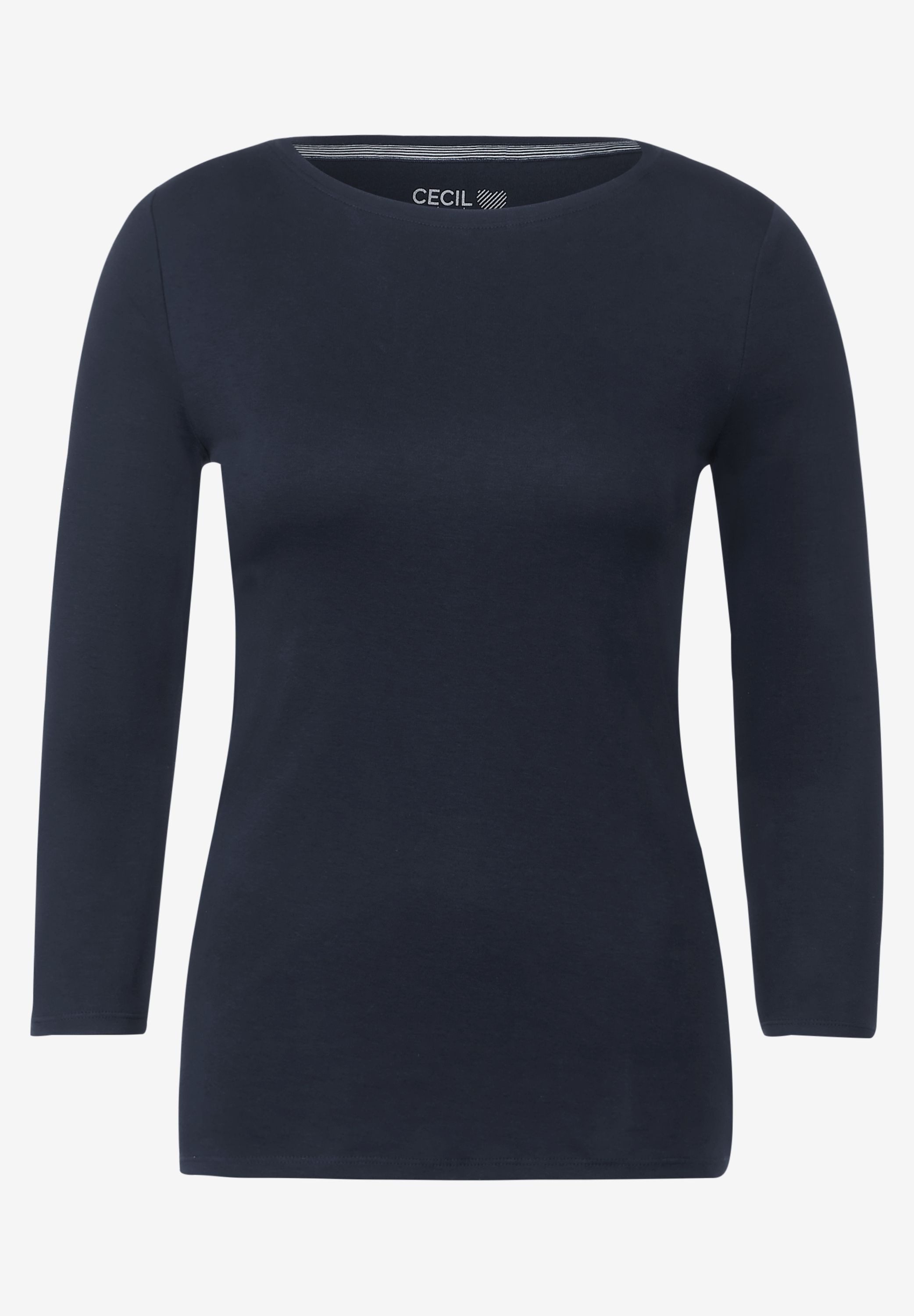 Schau dir das 3/4-Arm-Shirt von Cecil mal genauer an. Dieses Shirt hat einen U-Boot-Ausschnitt mit eingefasster Kante und ist hüftlang sowie tailliert geschnitten, sodass deine Silhouette schön betont wird.