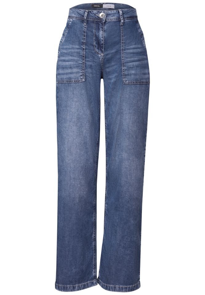 Die High Waist Wide Leg Jeans von CECIL überzeugt mit ihrem modernen Loose Fit, hohem Bund und fließendem Fall dank des hochwertigen Lyocell-Elasthan-Mix. Die Wide Legs sorgen für ein luftiges, bequemes Tragegefühl, während die Mid-Blue Used Wash vielseitige Kombinationsmöglichkeiten bietet – von sportiv bis elegant. Seitliche Eingrifftaschen ergänzen das Design funktional und modisch.