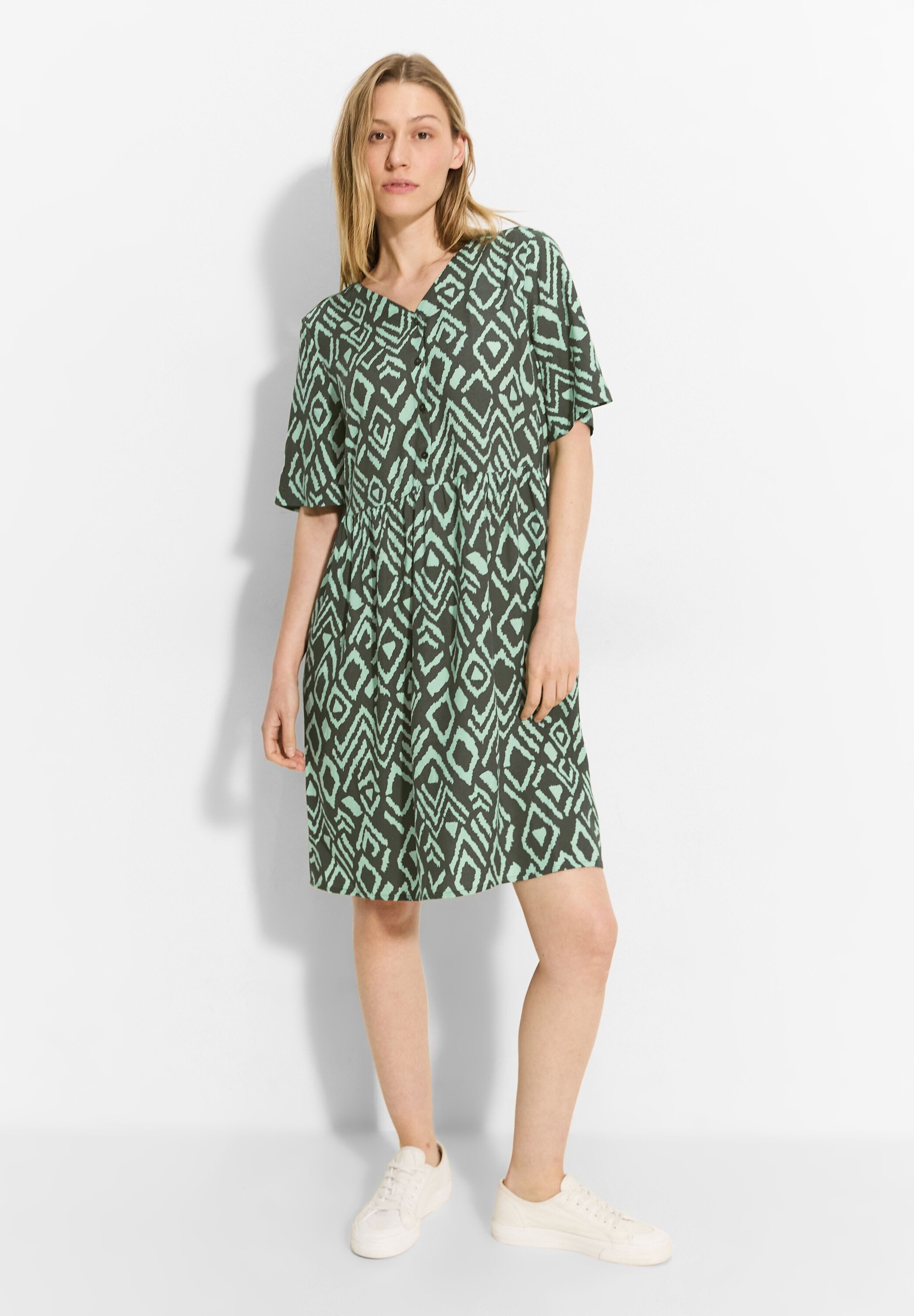 CECIL Sommerkleid mit Print, Kleid knielang, V-Ausschnitt mit Knopfleiste, leichte Glockenärmel, leicht tailliert, grafisches Muster. Das Sommerkleid von CECIL für Damen präsentiert sich mit einem attraktiven Print und einem knielangen Schnitt, der ideal für warme Tage ist. Der V-Ausschnitt mit Knopfleiste verleiht dem Kleid eine elegante Note. Die leichten Glockenärmel und die leichte Taillierung sorgen für eine feminine Silhouette, während das grafische Muster dem Kleid einen modernen Touch verleiht.