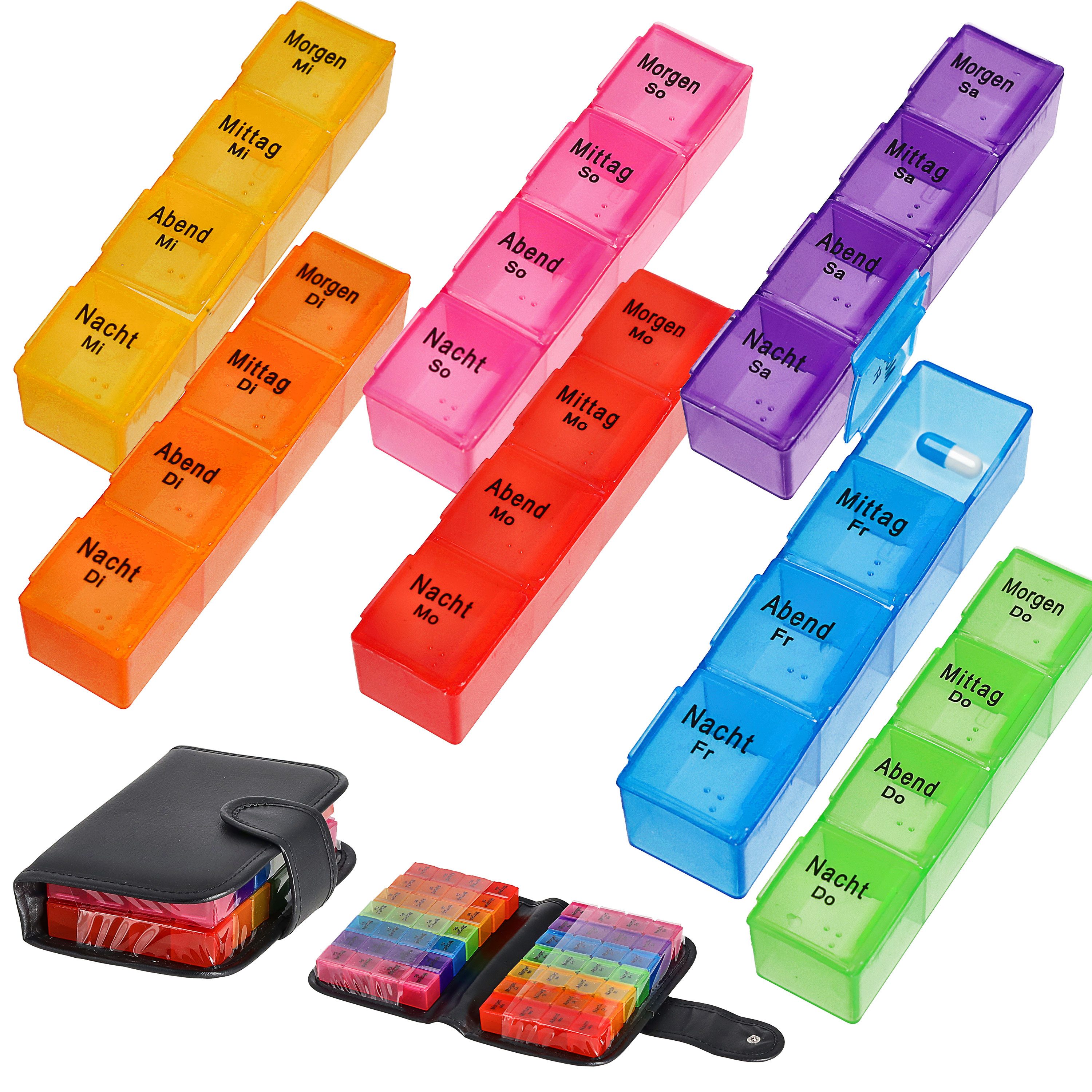 Tablettenetui mit Druckknopf und 7 farbigen Pillenboxen | ||||||||||