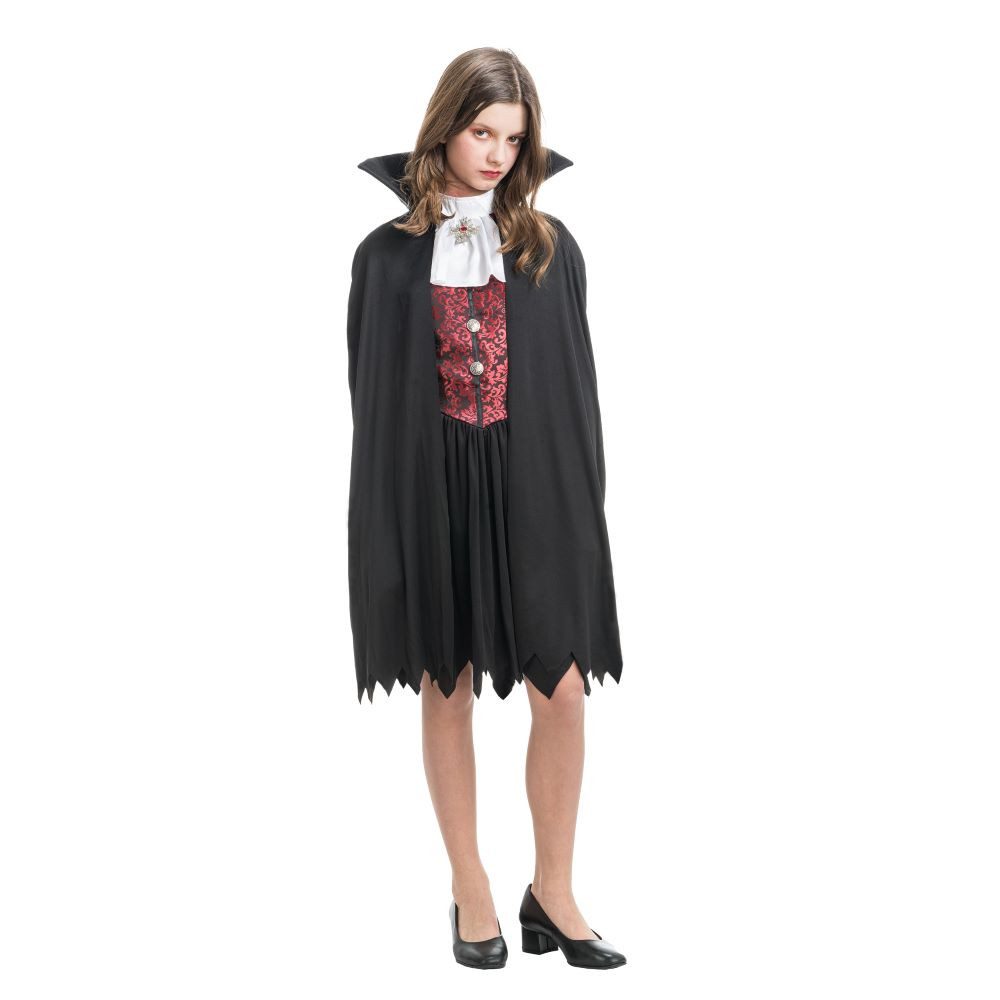 Das Vampirkostüm für Mädchen vereint Eleganz und düstere Mystik in einem beeindruckenden Design. Das Kleid hat einen gerade fallenden, schwarzen Rock, dessen Saum in gezackten Spitzen endet, was ihm einen gruseligen, aber zugleich verspielten Look verleiht. Der Rock schwingt bei jeder Bewegung und unterstreicht den dramatischen Auftritt des Kostüms. Das Oberteil des Kleides ist in einem tiefen, samtigen Rot gehalten und erinnert durch seine Struktur an luxuriösen Brokatstoff. Der Stoff ist leicht glänzend und zeigt feine, barockartige Muster, die dem Kostüm eine edle, viktorianische Anmutung verleihen. Das Rot des Oberteils bildet einen starken, aber harmonischen Kontrast zum schwarzen Rock und sorgt für einen auffälligen und klassischen Vampir-Look. Ergänzt wird das Outfit durch einen schwarzen Umhang, der mit einem hohen Stehkragen versehen ist. Der Umhang ist komplett in Schwarz und verleiht dem Kostüm eine düstere Eleganz, die den Vampir-Look perfekt abrundet. Der Umhang selbst fällt fließend und umrahmt das Kleid, während er im Wind schaurig wehen kann. Besonderes Highlight ist das Jabot, das um den Hals getragen wird. Es ist in einem stilvollen Weiß gehalten und mit einem markanten Kreuzabzeichen in der Mitte verziert, das silbern schimmert. Dieses Detail verleiht dem Kostüm einen zusätzlichen Hauch von Grusel und macht das Outfit zu einem perfekten, adligen Vampirlook für Halloween.