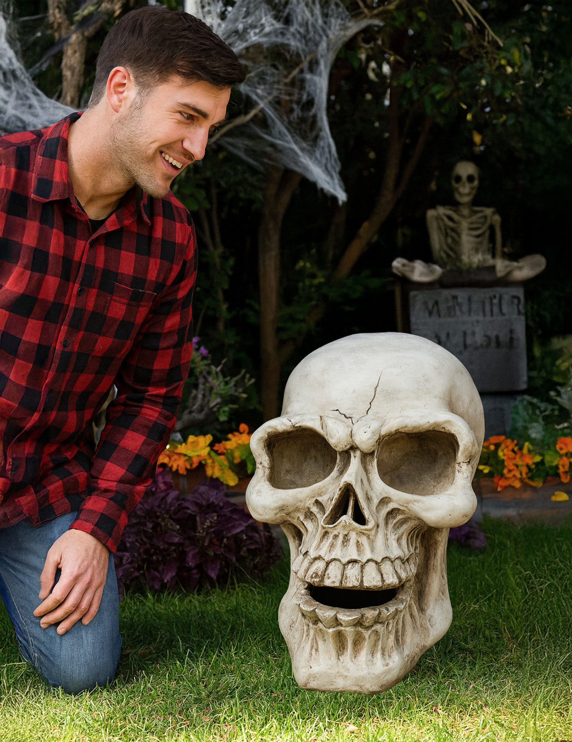 Verleihen Sie Ihrer Dekoration mit diesem XXL-Totenkopf aus Magnesium einen spektakulären Touch. Mit seinen beeindruckenden Abmessungen von 41 x 60 x 63 cm zeichnet er sich durch seine realistischen Details und seine sorgfältige Verarbeitung aus, die seinen furchterregenden Charakter unterstreichen. Perfekt für Halloween, ein Spukhaus oder eine Horror-Mottoparty, zieht dieses imposante Stück sofort alle Blicke auf sich und sorgt für eine düstere und beunruhigende Atmosphäre. Dank seiner robusten Konstruktion eignet es sich sowohl für den Innen- als auch für den Außenbereich.