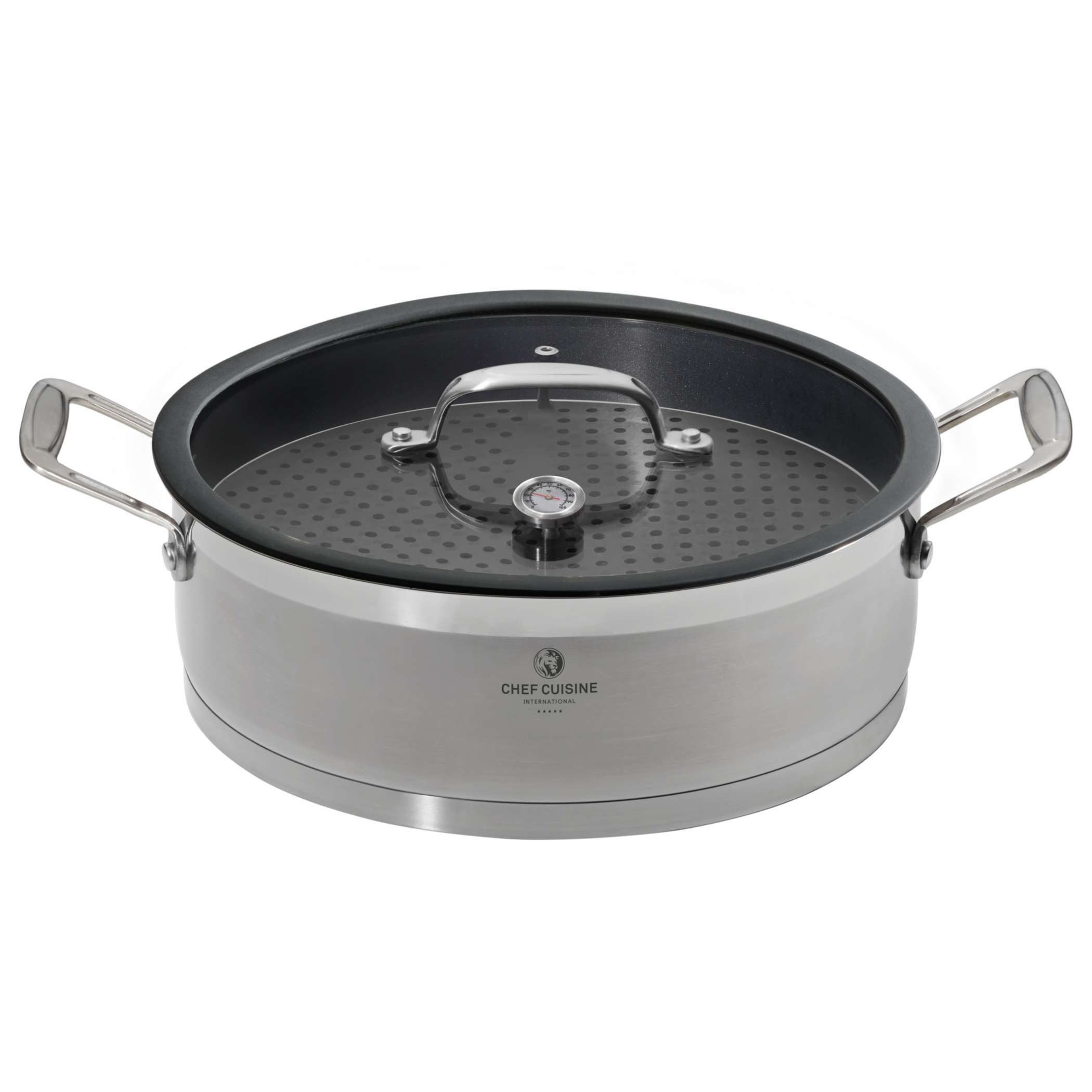 Vielseitig: Mit einem Durchmesser von 28 cm findest du auf dem stabilen Ablagerost aus Edelstahl ausreichend Platz für Gargut, die langlebige Silikonmatte verhindert dabei, dass feines Gargut durch den Rost fällt. Die Servierpfanne / Aroma Dampfgarer ist geeignet für alle gängigen Herdarten, inklusive Induktion und Backofen und mit einem passenden Glasdeckel mit Silikonrand, Dampföffnung und Thermometer ausgestattet, der bruchsicher und bis 180 °C hitzebeständig ist.