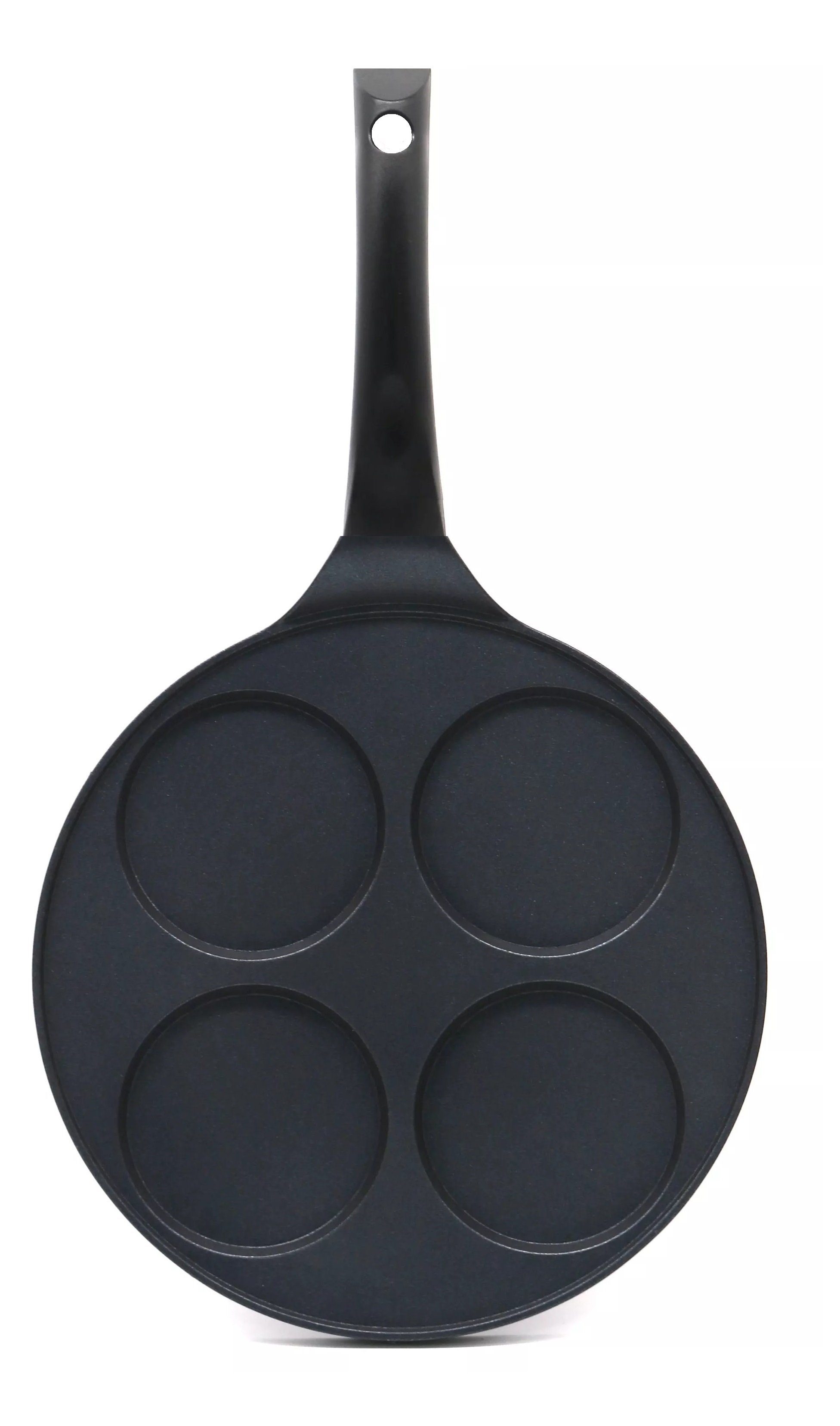 Die 4 perfekt geformte Pfannkuchen werden gleichzeitig zubereitet. Dank der 3-fachen Antihaftbeschichtung bleibt auch nichts an der Oberfläche kleben. Der massive Aluminiumguss sorgt für eine gleichmäßige Wärmeverteilung, sodass der Teig nicht anbrennt oder übertrocknet. Die Pfanne lässt sich schnell und einfach mit warmem Wasser zu reinigen.
