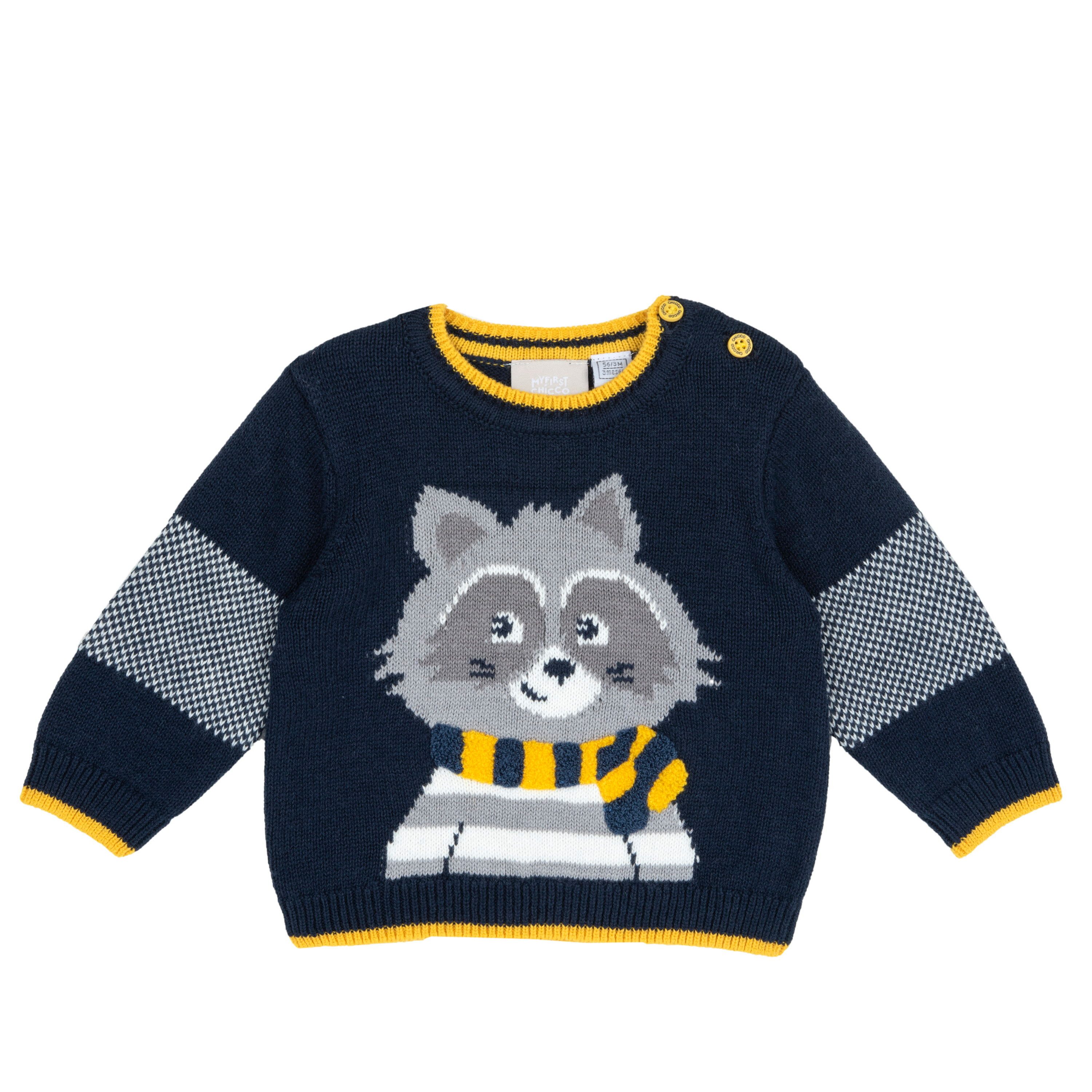 Chicco Baby Pullover – Weicher Strickpullover mit Waschbär-Motiv in Blau & Gelb | Perfekt für Herbst & Winter. Dieser bezaubernde Baby Strickpullover von Chicco ist ein Must-have für die kühle Jahreszeit. Das niedliche Waschbär-Motiv auf der Vorderseite verleiht dem Pullover einen verspielten Look, während die Kombination aus dunkelblauem Strick mit gelben Details an Kragen, Bündchen und Saum für stilvolle Kontraste sorgt. Der langärmelige Pullover ist aus hochwertiger Baumwolle gefertigt, die für ein angenehmes Tragegefühl sorgt. Dank der praktischen Knöpfe an der Schulter lässt sich der Pullover leicht an- und ausziehen – perfekt für den Alltag mit deinem Baby oder Kleinkind. • Weicher Baumwollstrick für höchsten Komfort und Wärme • Verspieltes Waschbär-Motiv mit gestickten Details • Elastische Bündchen für eine optimale Passform • Seitliche Knöpfe an der Schulter für einfaches Anziehen • Perfekt für Herbst & Winter – ideal für kühle Tage