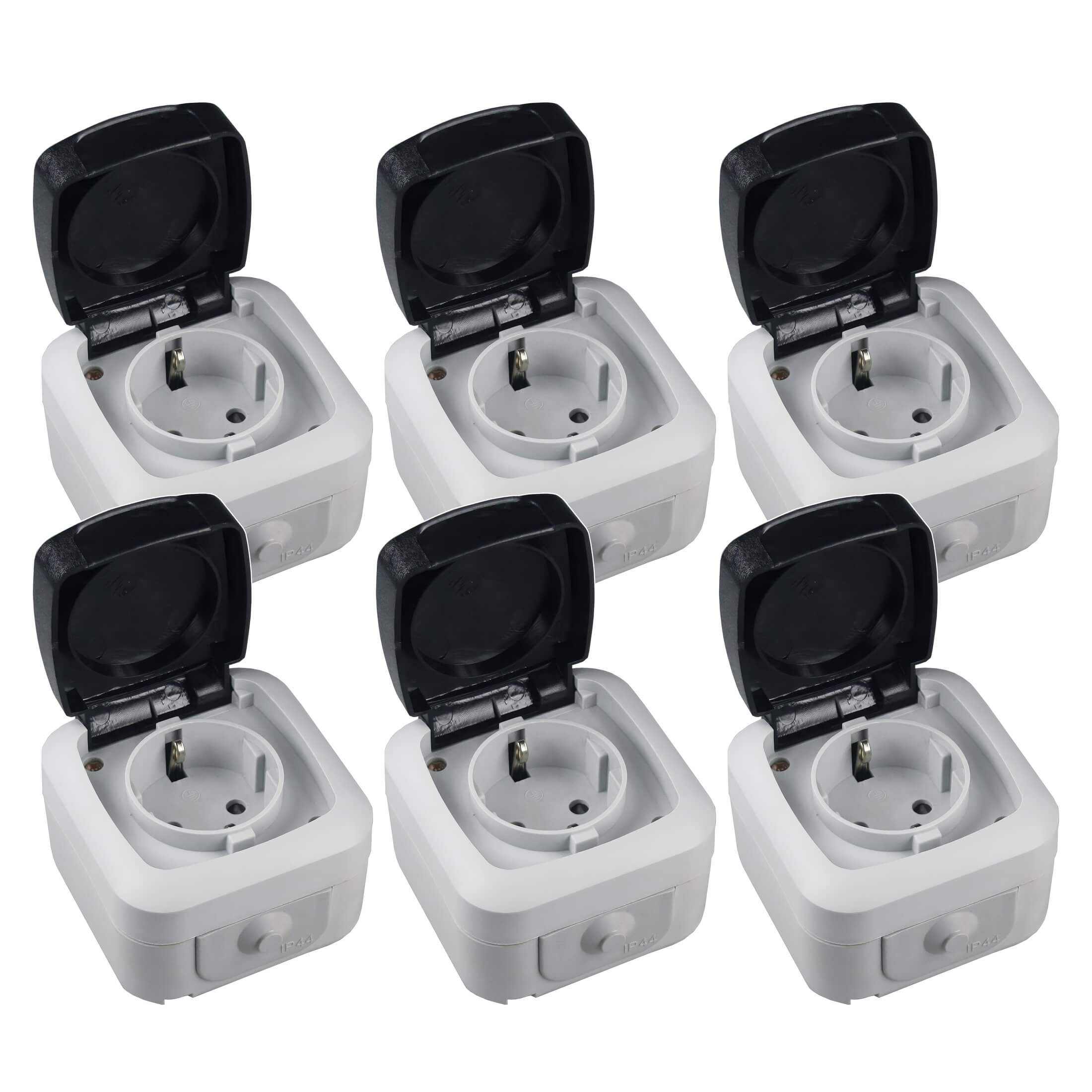 6er Set spritzwassergeschützte Steckdose in Aufputz-Ausführung für 250V/50Hz, max. 16A.