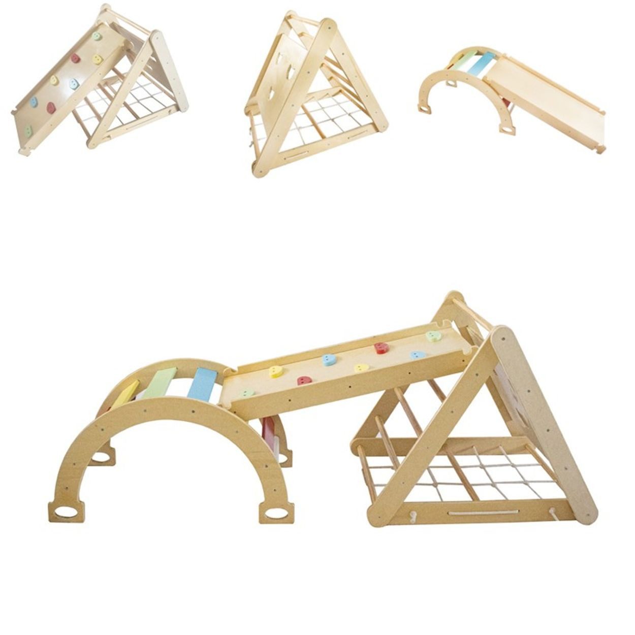 Ausstattung | Holz-Kindercenter 6 in 1, Kletterdreieck, Kletterseil, Kletterleiter, doppelseitige Rampe, |