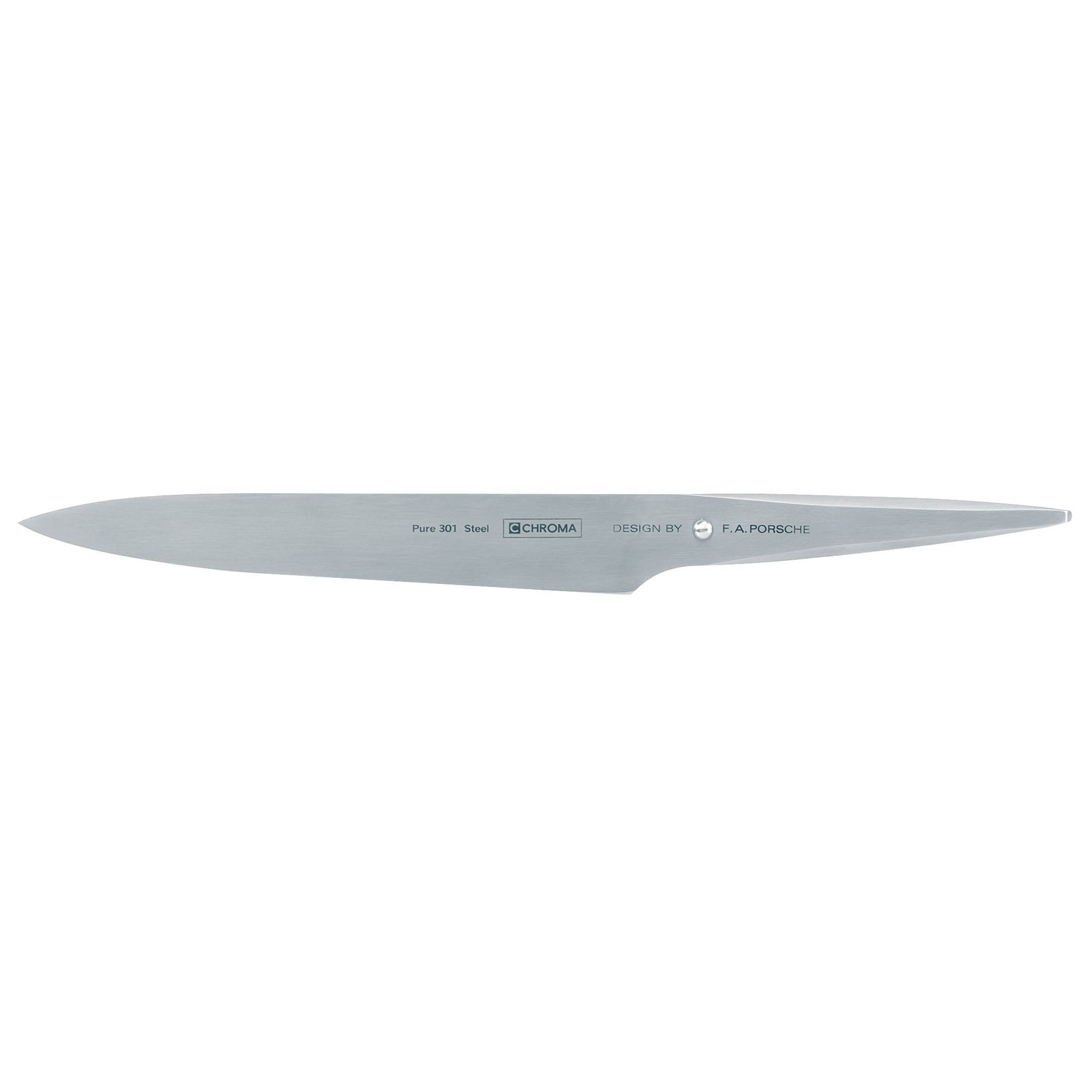 Das große P-05 Chroma Type 301 Tranchiermesser 19,3 cm trennt Fleischfasern glatt voneinander, löst Knochen effektiv und auch das Zerteilen von Braten und Geflügel ist hiermit spielend einfach. Doch Vorsicht: wie alle Chroma-Messer sollte das P-05 Chroma Type 301 Tranchiermesser aufgrund seiner enormen Schärfe nur in geübte Kochhände gelangen.